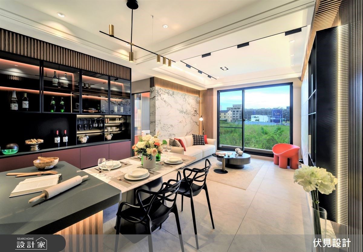 18坪預售屋,小至家具造型,大至空間佈劃,皆以簡約大方的設計理念,寫下俐落的現代感,並巧妙融合鐵件、鍍鈦金屬、磁磚與壁紙等豐富的異質材,體現法式風格的輕奢與浪漫。此外,更貼心打造森林系的衛浴空間,讓綠意窗景陪伴美好的泡澡時光,全然釋放束縛身心的外在壓力。
