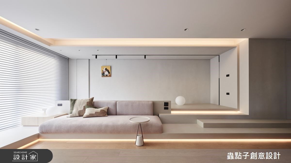 一家五口居住的生活空間,需要強大的收納機能,客廳電視牆上下設有收納櫃設計,為了使空間更加活潑,於上下櫃體之間加入藍色造型層板,展示與收納並存,臥室場域則將床架下方空間加入收納櫃,滿足五口之家收納機能。公領域牆面為白、灰色拼接,簡約設計富有沉靜感,為了使整體空間增添活潑氛圍,在電視牆上加入藍色層板,塑造公領域視覺焦點,臥室內部則延續客廳藍色調,使整個家中具整體感。
