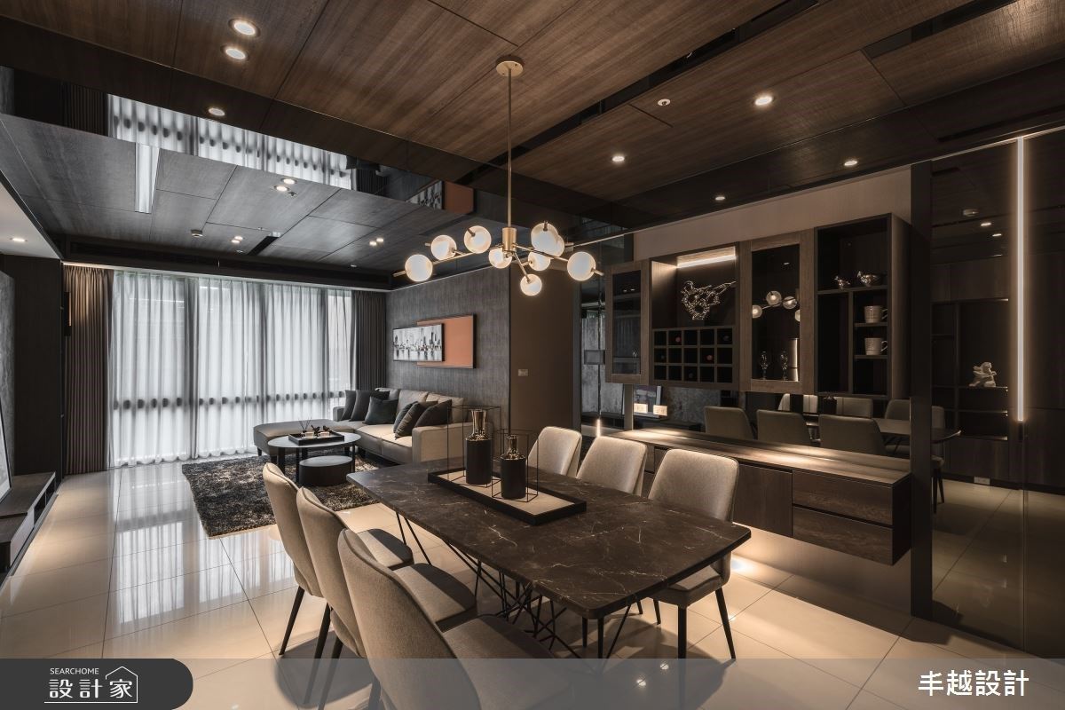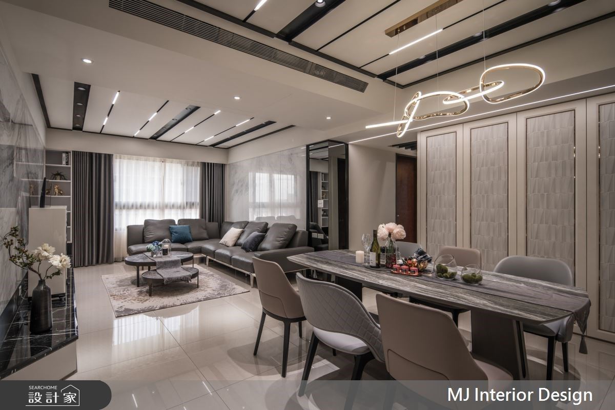 入室後白色、大理石、黑色元素映入眼簾,時尚家居的氛圍奠定了第一印象;玄關處大型收納櫃一路從餐廳延伸至電視牆,穿插了不同建材元素堆疊白色調空間,並善用鏡面的視覺反射效果讓空間層次更豐富,同時帶有開闊空間視野的巧思。著眼於天花板,藉以嵌燈與黑色溝縫修飾矮樑,也透過黑色線條的延伸,完整黑灰白為主的空間美學。客廳以大面積大理石作為電視主牆,氣派的選材開展了客廳的尺度,山水般的石紋脈絡也替生活注入精緻人文氛圍。沙發背牆挑選同樣的石材搭配,角落則由黑鏡收邊,弱化廊道的窄長視覺。 建於廚房空間較小,設計師便在餐區打造彈性全開的大型電器收納,帶來實用的收納機能;餐桌區以木紋餐桌、設計單椅組構而成,配上弧型線條燈飾,打造美好的用餐情境;半開放式的備餐櫃上方以開放設計呈現,由石材薄板、鐵件層板打造而成,在燈帶的伴隨下,呈現自然而時尚的美感,同時也滿足了女屋主需求。