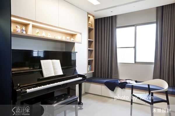主臥空間延續公領域的黑白配色,搭佐些許金屬線條、石材提升細膩層次感,小孩房則以天藍色為基底,並加入圓弧、格柵語彙,突顯活力清新感。