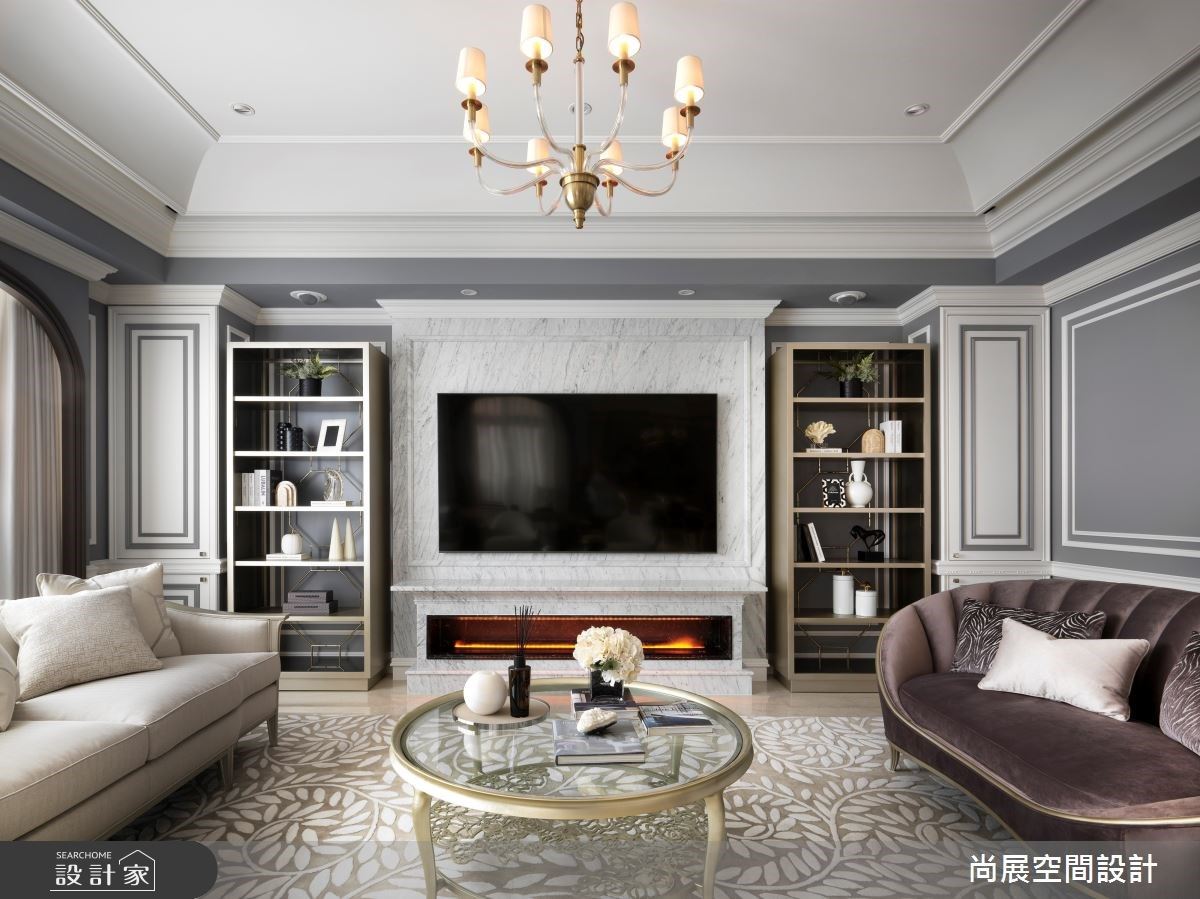 獨立的玄關區域,以圓弧造型的天花設計,搭襯華麗氣派的水晶燈,並在純白線板的端景牆,擺上一只湛藍矮桌和花卉,瞬間恍若走進經典的歐美大宅。寬敞方正的客廳區域,整面落地窗引光入室,形塑通透明朗的空間氣場,而菱形交織的天花造型,以俐落的美式線板收邊,運用簡約大方的手法,將焦點留給閃耀熠熠的水晶燈飾,讓人沉浸奢華大器的氛圍。至於電視主牆,採用暖心文化石,佐以兩側的玻璃格子櫥窗,在溫潤沈穩的面貌裡,挹注一絲時尚優雅的氣息,也和沙發背牆相互呼應。