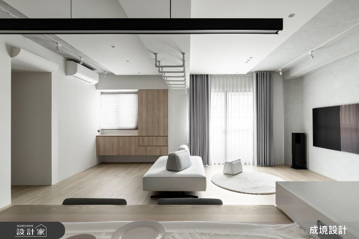 針對兩間男、女孩房,前者以藍天意象為主題,帶來翱翔天際的自由氛圍,並透過簡約的純白展示架,發揮立面的實用機能;後者使用上下舖,將房間一分為二,再各自刷上鵝黃及粉紫,為兩姐妹保留個人的隱私性,又能擁有衣櫃、書桌等配備,而牆面最上方,不忘以開窗造型引渡光線,讓裡、外兩側都能擁有明亮感受。