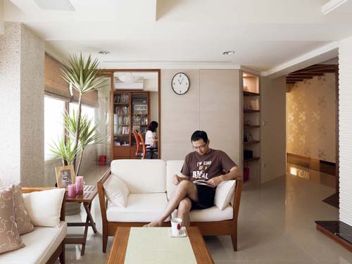 入門玄關處以雙拱門造型,巧妙昇華迎賓儀式感,同時明確落塵區與公領域的分野,其次於地坪處鋪敘魚鱗狀花磚,塑造繽紛活潑的居宅第一印象;邁入公共空間,捨棄既定隔間以開放式設計,獲取開闊寬敞的視覺感受,同時大面迎窗處增設百葉窗,不僅使海岸景觀化身居家景深,更形塑有趣的光影變化,其次於天花與地坪處鋪陳溫煦木質,適時保留居家空間所需的暖度,最後更運用天花的古堡木樑造型潤飾樑柱、管線等處,打造觸手可及的生活美學;最後,運用櫥窗造型推拉門,可彈性地區隔公私領域,當屋主獨自一人在家時,也能敞開延伸空間感,蕨類造型床框的雙人床亦成為生活中的一隅端景。