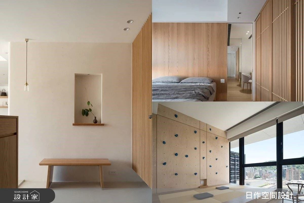 開放式廳區中從木地板、櫃體到沙發椅凳皆依循淺木搭白色的調性,採取接近 1:1 的配比呈現舒適的平衡感;沙發後方規劃吧台式書桌,並活用窗邊空間打造寬坐面臥榻,在開放客廳中細膩劃分不同氛圍與機能的休憩空間。主臥床頭燈與開關鑲嵌在床頭板,僅擺放單邊床頭櫃單純化機能與視覺;床尾系統櫃牆為主要收納,複合式設計結合門片衣櫃、開放式吊掛以及系統板材打造的多功能桌面,營造出空間感佳、機能豐沛的睡眠環境。