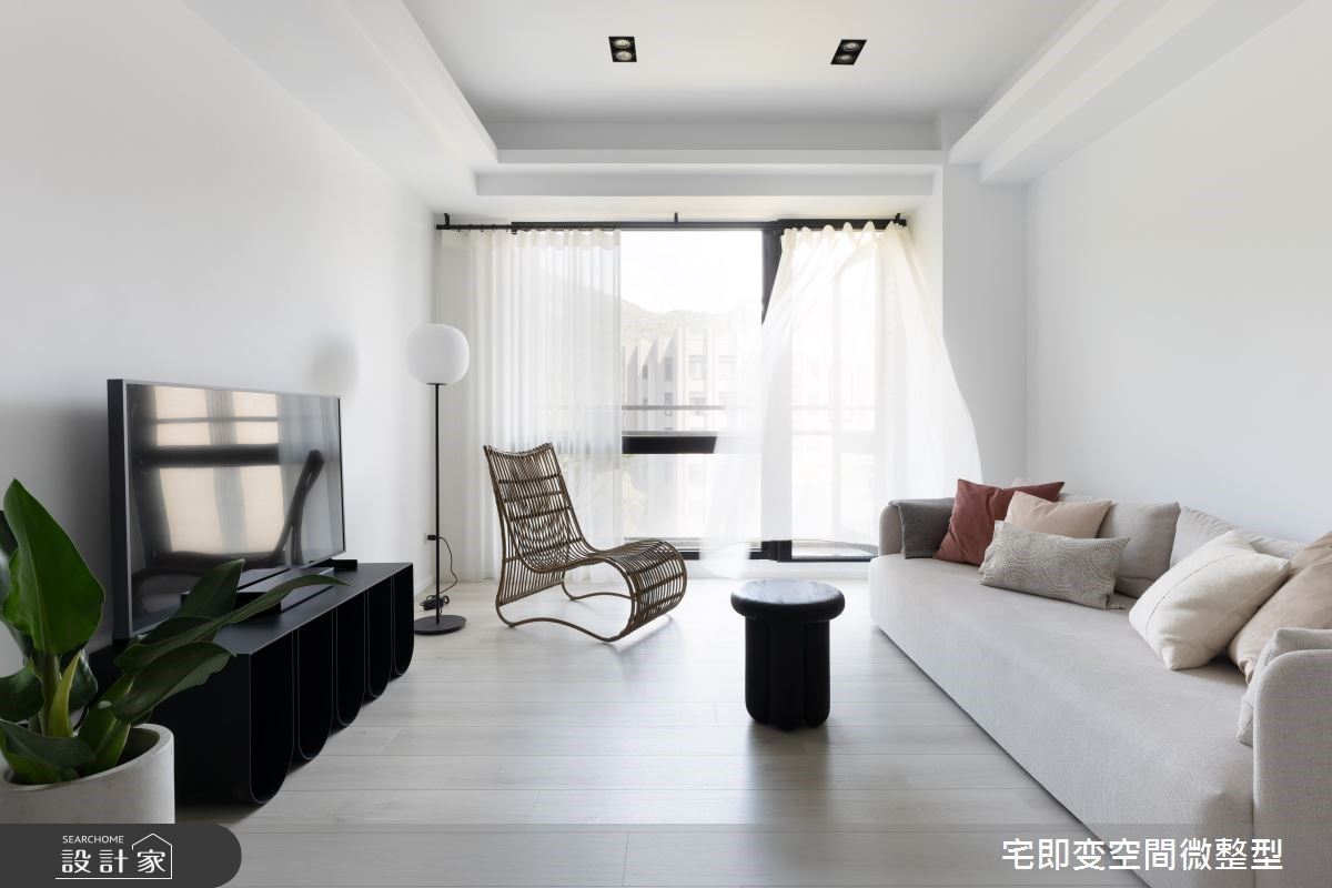老屋翻新要在預算內做到滿意其實不難!17.3 坪大的中古屋改造計畫中,以清新自然的無印風為主題,恰到好處的設計感與優良的採光配置,讓小坪數住宅顯得格外寬敞。進門玄關利用異材質地坪界定出落塵區,透過系統板材訂製收納完美整合鞋櫃與電視櫃,不落地設計讓櫃體更顯輕盈,更讓掃地機器人清掃時能暢行無阻。