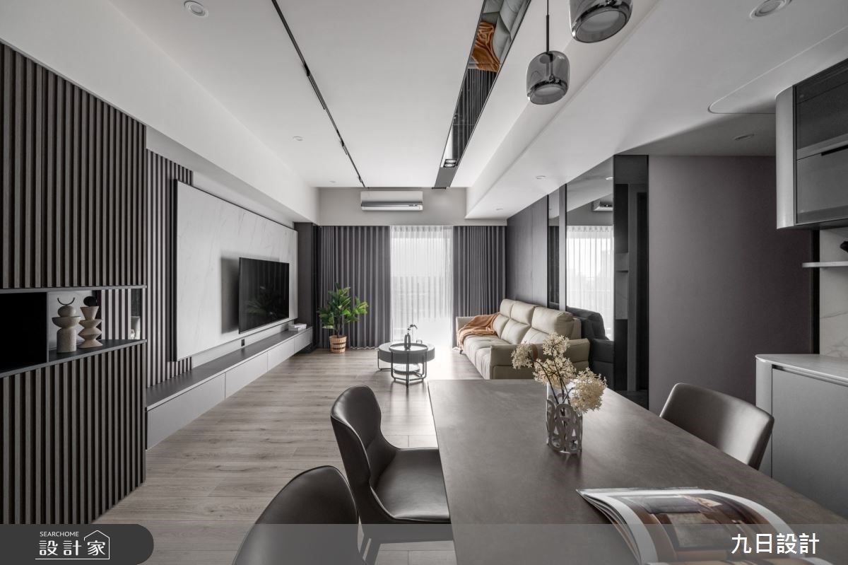 客廳空間以灰白色調為基底,讓視覺重點落在白紋大理石電視牆上;輕薄的不鏽鋼層板取代一般電視櫃設計,簡約俐落的天花板與吊隱式冷氣,形塑清爽乾淨的空間氛圍。客廳旁的餐廳牆面鋪陳灰色薄磚,將灰色的調性自然地延伸拉長空間尺度;封閉式廚房改為長虹玻璃拉門,保有採光與視覺的通透感,但又能解決熱炒時油煙飄散的問題。