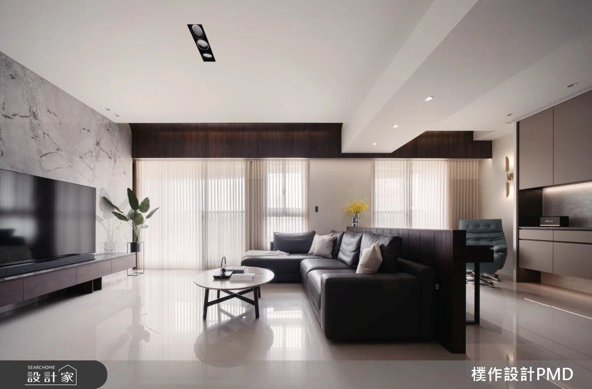 玄關區透過深木紋地坪鋪設領域,且搭配深色木質櫃體打造鞋櫃功能,讓回到家的屋主能夠轉換思緒、安定身心。開放的公領域裡,延伸大面採光的優勢,天花巧遇大樑結構,透過柱體交織面埋入空調出口,並安排嵌燈照明,美化量體且營造出挑高的天際視野。電視牆以鮮明的粗獷肌理石材打造,漸層立面的堆疊,替公領域挹注生命力;客廳擺設大型L形沙發,延伸空間的縱軸與橫軸尺度,大面積的身形設計,讓屋主自在享受坐、臥、躺的愜意姿勢。