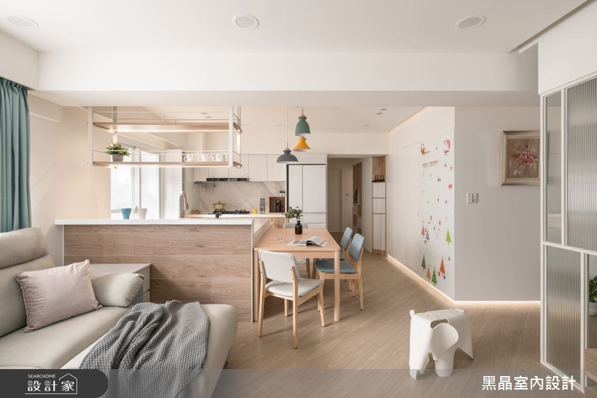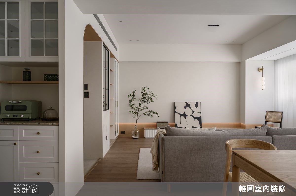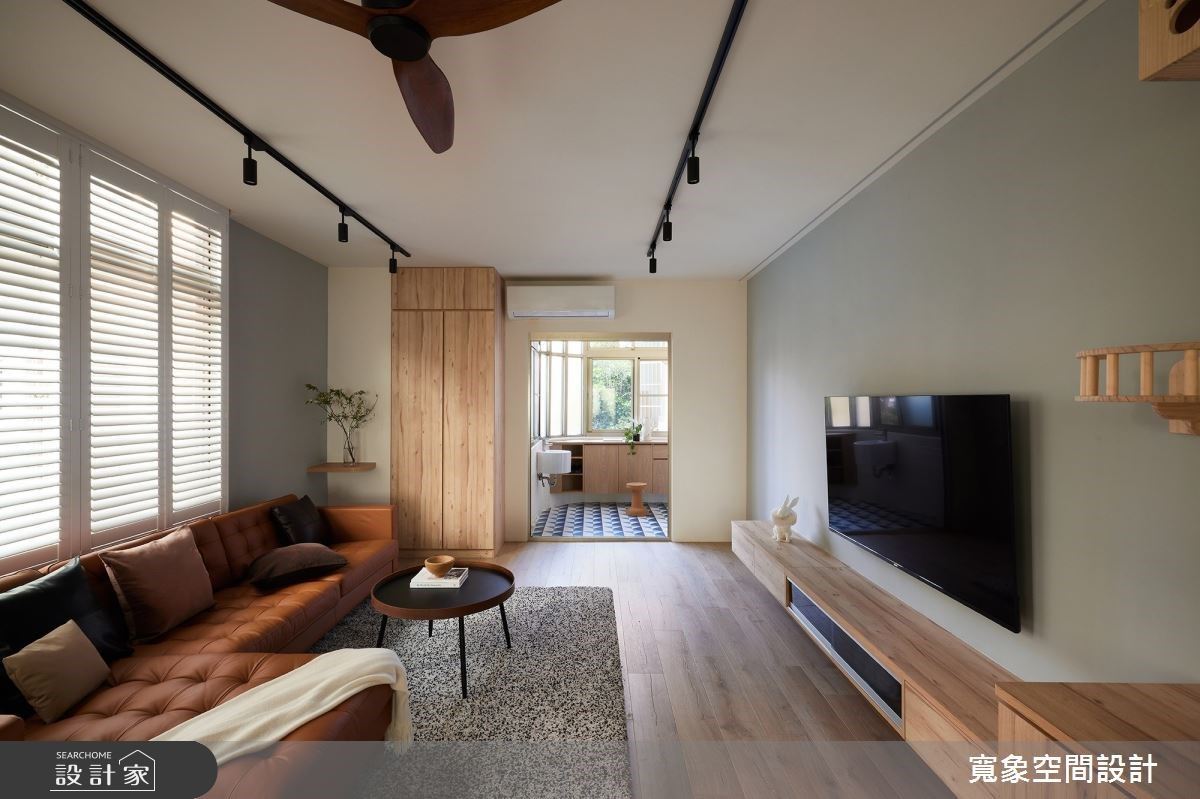 入內後花磚改為溫潤的超耐磨木地板,沙發邊規劃了大型衣帽櫃用來吊掛外衣和包包;沙發背牆大面的鋁窗加裝實木百葉窗,天花板循環扇設計更提升了室內通風,不僅美化了空間、也提升隱私性亦保有良好採光。考量到屋主飼養四隻貓咪,特別在電視牆訂製貓跳台與貓窩,更打造天梯串連電視牆與餐廳,讓貓咪可以自由穿梭不同區域也不會影響動線,創造人與寵物都能自在的生活環境。廚房以玻璃拉門和拱廊劃分場域,兼顧了空間感與使用上的彈性;而餐廳的實木長桌與吊燈則揉合了男屋主喜愛的工業風格,實踐夫妻與寵物心目中的理想居宅。