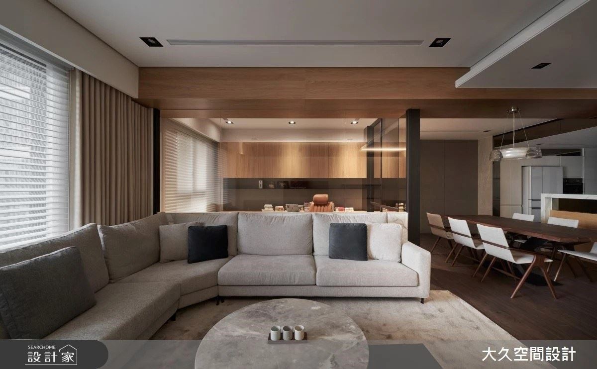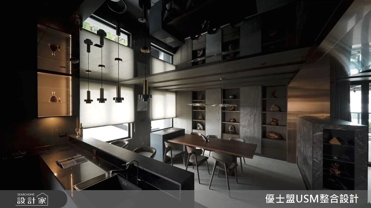 客廳與餐廳隔間牆以玻璃和大理石異材結合營造通透感,因廚房天花不須掛主機,天花高度得以再提升,且挑高部分使用實木皮與客廳天花呼應,立面設置備餐櫃與中島吧檯,增加收納機能外也修飾開門見灶的風水用題,樓梯旁立面設置木格柵與展示櫃用以活化坪效,並將梯面重新包覆木地坪,挹注居家溫馨質感。