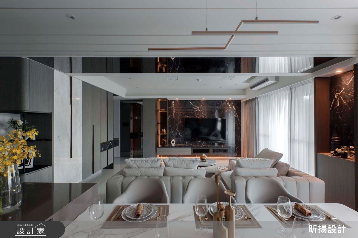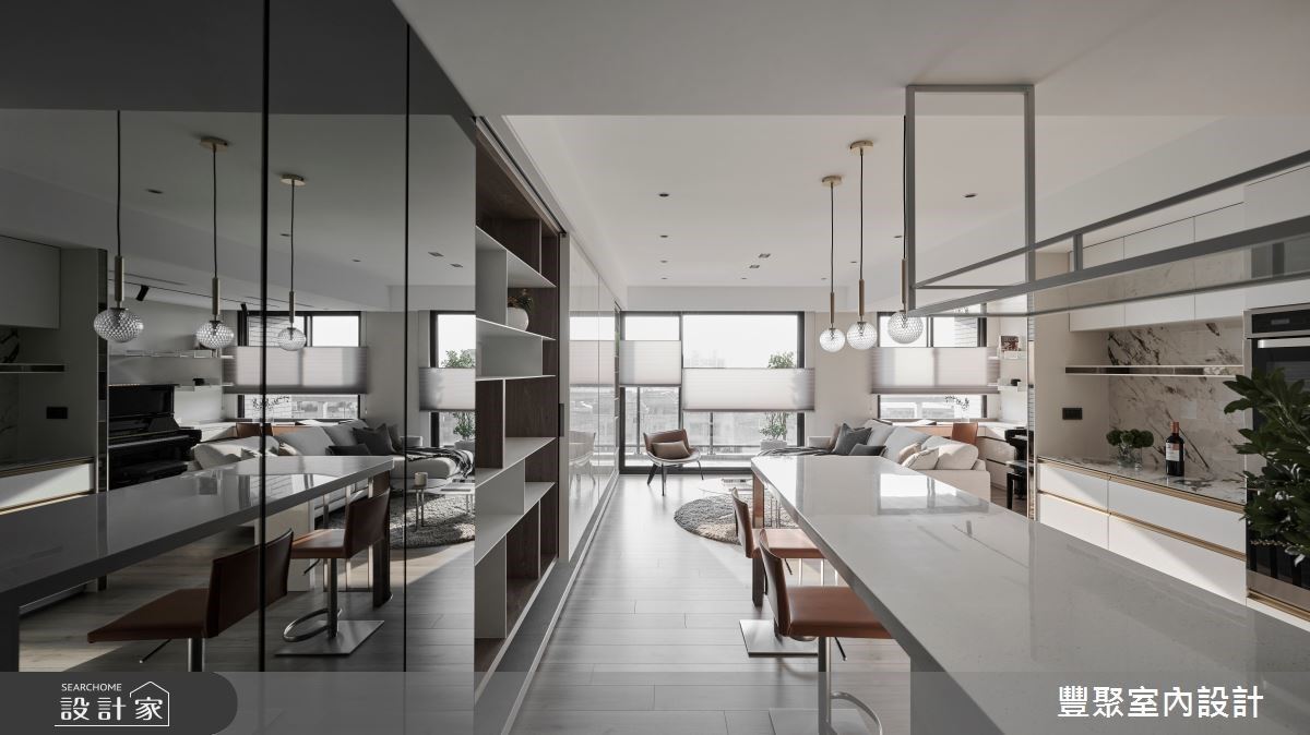入門玄關處鋪敘深色調石材肌理,營造回家後沉澱安穩的心緒,同時前方處規劃外出衣帽間,使整裝外出的動線更加方便順暢,最後為了豐富立面設計,內嵌線性鍍鈦金屬,讓俐落分明的直線律動遊走其中;邁入敞亮公領域,場域色彩改以深色木質為基底,營造居家空間所需的暖度,其次敞開客、餐廳兩大生活空間,更以木質格柵拉門圍塑書房場域,將彈性隔間運用於此處,不僅化身沙發背牆的視覺端景,更可依據屋主需求彈性調整書房型態,無形中凝聚了一家三口的情感交流。