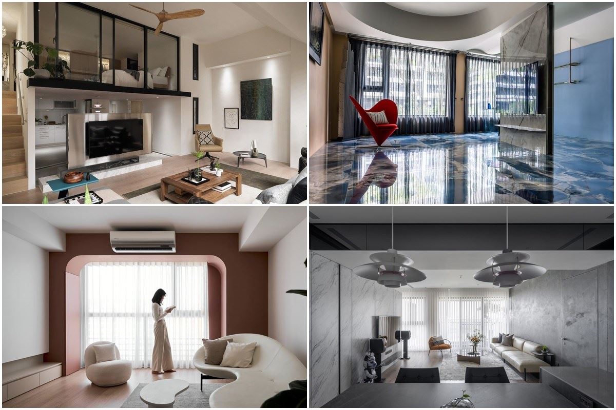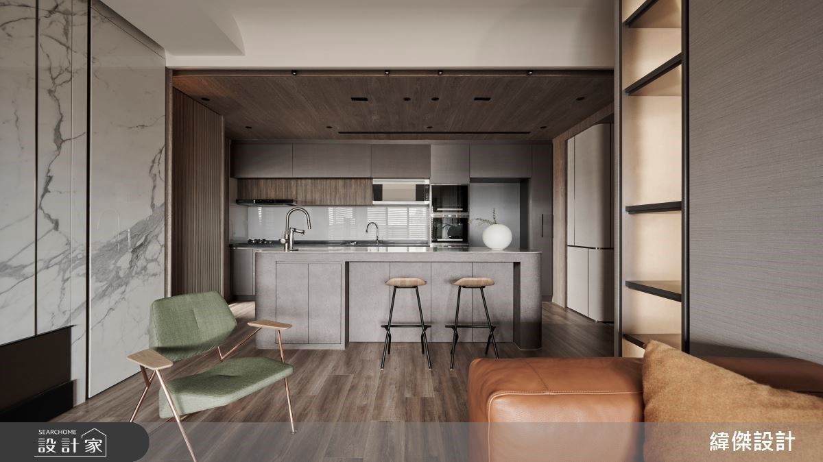 現代風居宅以簡約色調鋪陳,並以書法用墨手法將深、淺色相呼應,再以建材本質紋理,增添同色系層次,簡約沉靜富生命律動的空間。客、餐、廚空間為開放式設計,放大空間感,客廳後方規劃開放式書房,架高地坪明確場域性。客、餐廳之間以雙面半高電視牆區隔,通透感之餘還能確保隱私。廚具沿牆面規劃並延伸至餐桌旁,放大料理區域,懸浮收納櫃增添收納空間,機能十足。