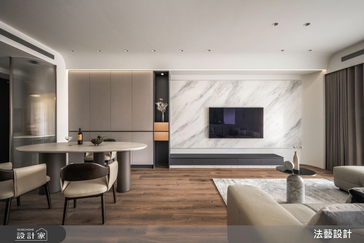 從門口進入室內,開闊舒適的空間感令人眼前為之一亮,透過開放式設計和自由的動線,打開公領域的明亮感受。餐廚區以一字型廚具結合中島和餐桌,擴大料理備餐的使用範疇,用餐區兩側分別規劃冰箱、櫃體和洞洞板收納,增加收納效益和餐廚機能。