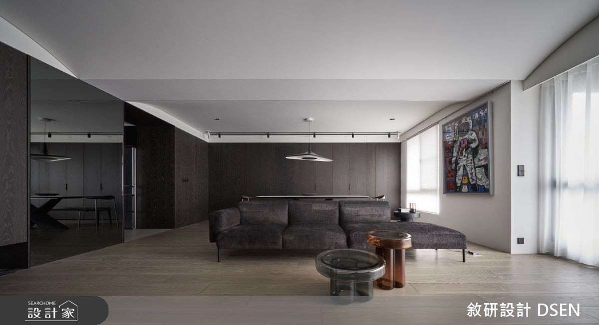 入室後的玄關以魚骨拼地坪鋪陳,而白色落地收納櫃利用色彩與大空間調和,視覺俐落,牆面掛畫與下方壓克力層板在光線襯托下形成輕盈的展示空間,於居宅入口處點出屋主對美學的堅持。沿著人字拼地坪步入客廳,以彎曲落地型態呈現的窗簾,富有優美浪漫的體態,沙發邊mini bar以復古的煙燻木皮搭配白色石紋交織,為日常生活增添儀式感。沿牆面規劃的壓克力層架,以精湛的工藝將壓克力與纖細的鐵件支架結合,不僅視覺輕盈,承重能力也不容小覷。用餐空間位於書房與客廳之間,煙燻木皮與中性色調交織出典雅質感,寬敞的檯面使空間使用彈性更大。獨立書房拆除實體隔間,改以玻璃隔段取代,視覺通透且空間感開闊,寬敞的工作長桌與療癒的沙發單椅,同時滿足辦公與閱讀需求,而後方木質層架延續客廳層架輕盈語彙,滿足屋主大量藏書需求。