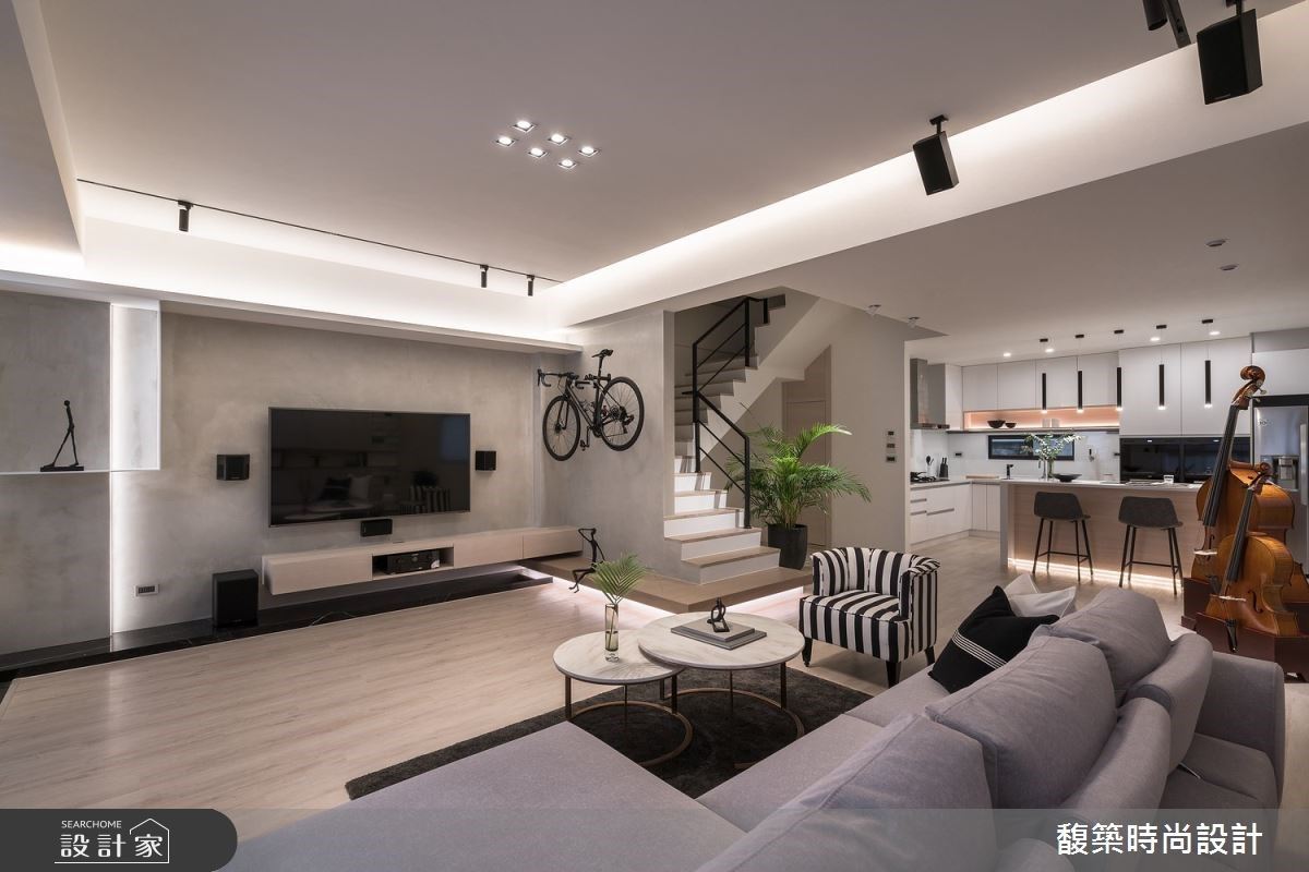 四層樓建築,依居住成員需求及興趣打造,分層規劃滿足多元需求。1 樓公領域電視牆面鋪陳屋主喜愛的藍色調,在灰色空間中製造畫龍點睛的效果,也提升住宅的暖度。甫進門,視線順著玄關、普魯士藍電視牆到餐廚區的黑色陶瓷烤漆面板牆,色彩與材質型塑美感,是美麗的居家端景牆,也滿足海量收納。