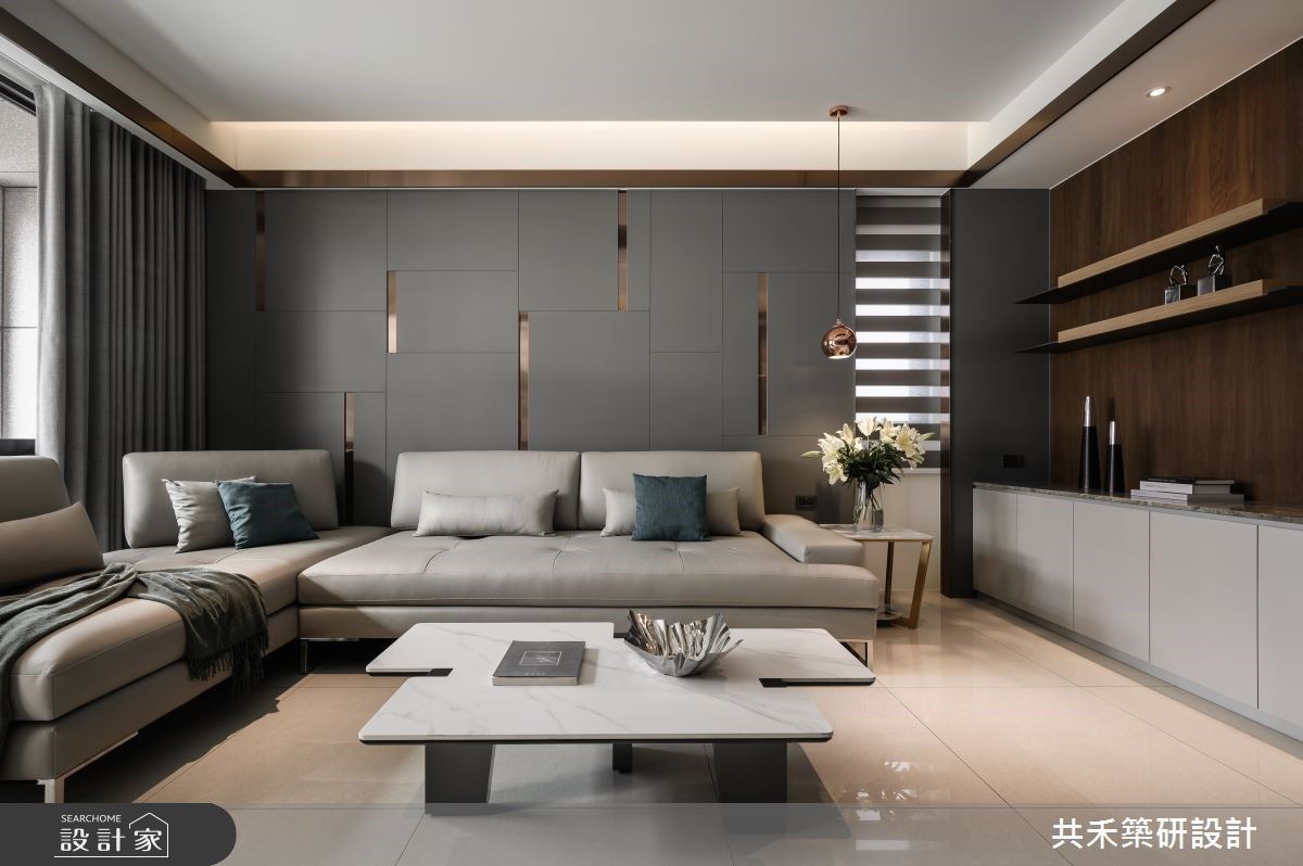 設計師於空間融入大量灰玻、灰鏡等富有反射特性與通透視覺的建材,將空間感延伸,再透過藝術塗料點綴層次,不動格局也能擁有強大收納與空間寬敞的完美居宅。