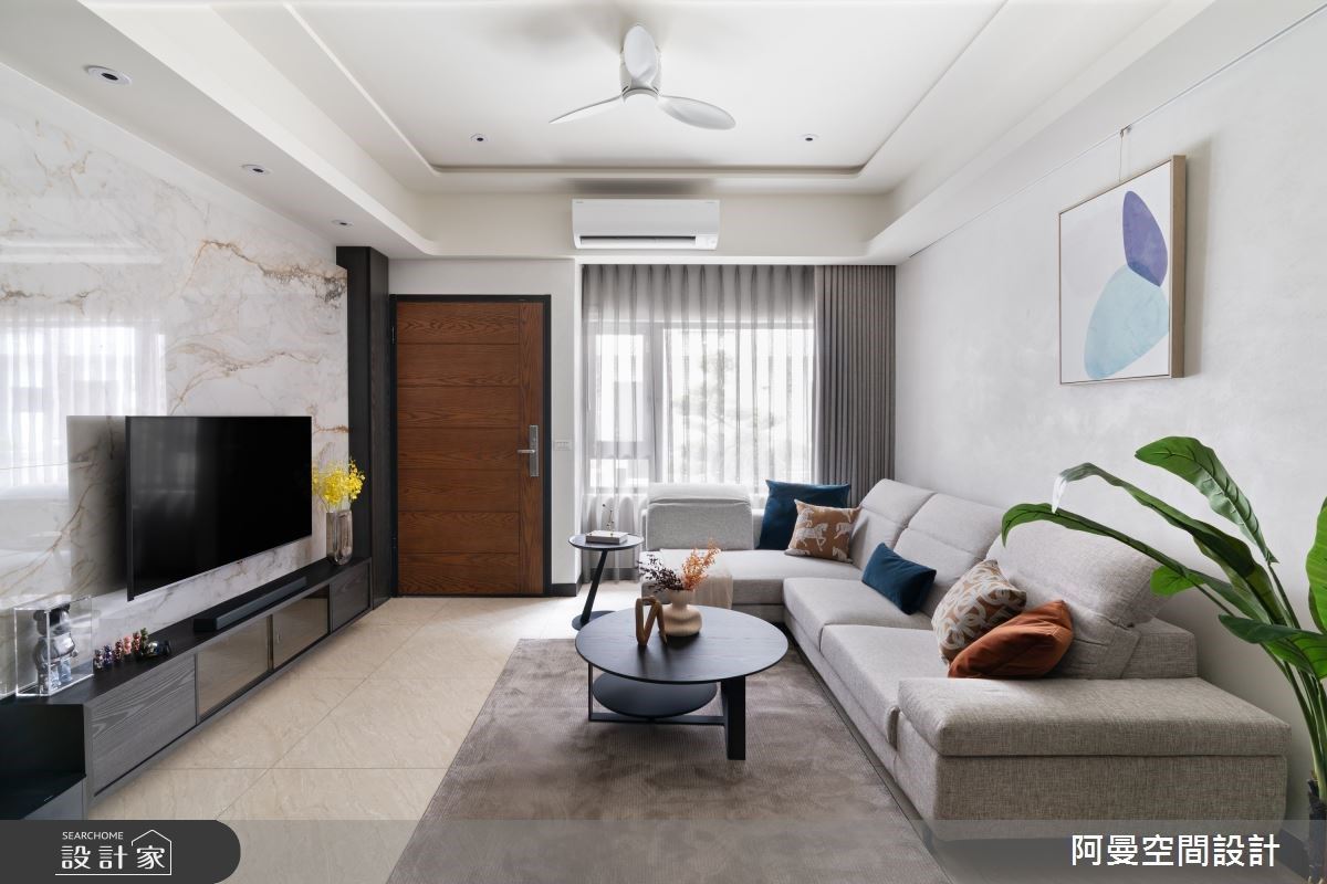40 坪新成屋微調格局優化動線、升級住宅機能,並透過異材質堆疊沈穩色調凸顯現代風大器風範。玄關櫃別緻的大理石門片與展示櫃升級收納質感;櫃體交接處加入異材質於立面創造豐富變化性;霧面石紋設計襯托帶光澤的大理石電視牆,詮釋現代星級飯店的輕奢感。