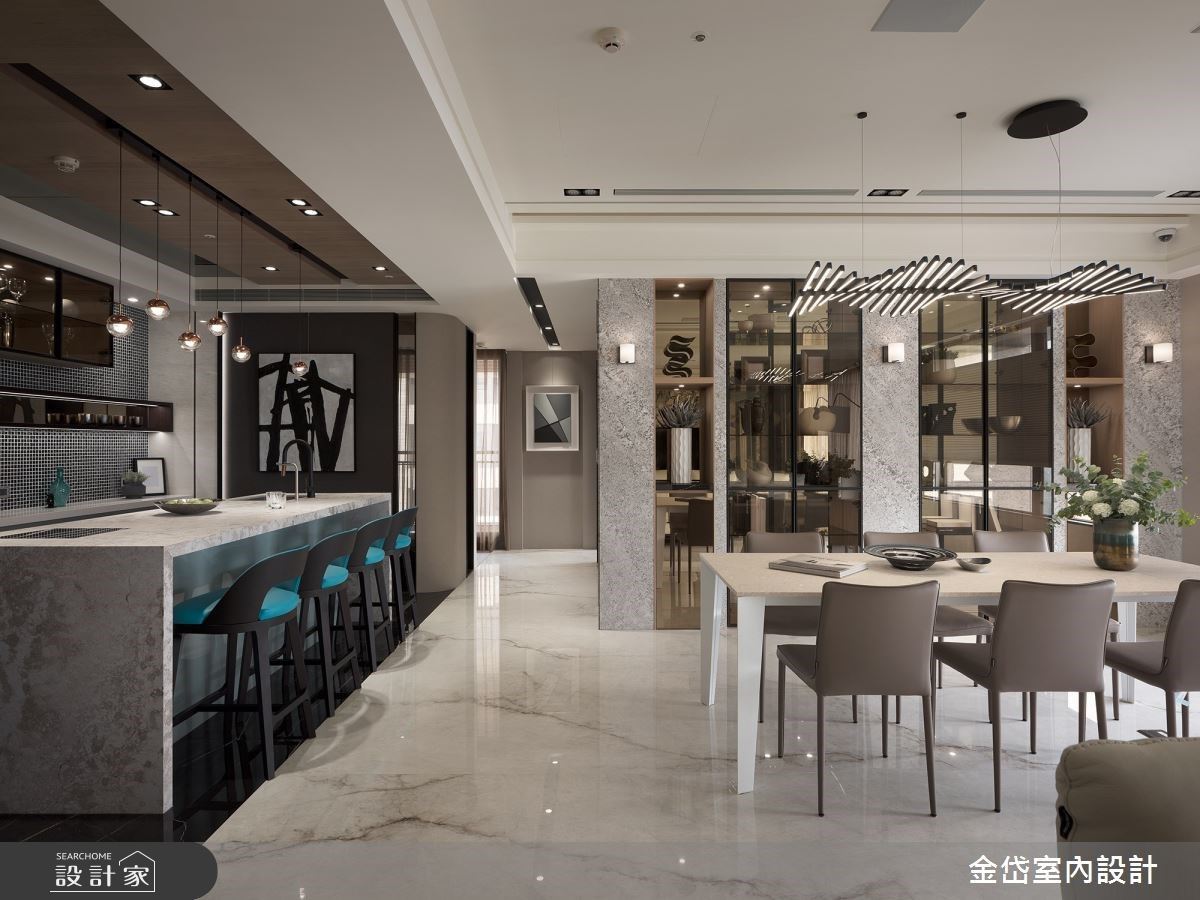 入室玄關以深色六角磚地坪勾勒明確落塵區,因玄關與樓梯彼鄰,巧妙利用下方空間規劃收納與放置掃地機器人的空間,視覺更清爽,為保有客廳隱私,選擇於沙發邊規劃長虹玻璃屏風,以透光不透影的效果引入自然光線,隱私與通透感兼具。客廳天花將各式管線與空調隱於平面之下,再搭配內嵌式燈飾,拉高天花視覺消弭天花過低產生的壓迫感。電視牆立面以石紋鋪陳,搭配湛藍電視櫃豐富視覺層次。客、餐廳開放式設計形塑通透的空間感,並沿牆體立面規劃餐水櫃與馬克杯收納空間將機能分流,用餐、飲水更順手。位於二樓的書房以輕淺色與木質勾勒,揉捻舒緩平靜的工作氛圍,也為男屋主提供一個能自在組裝模型的空間。