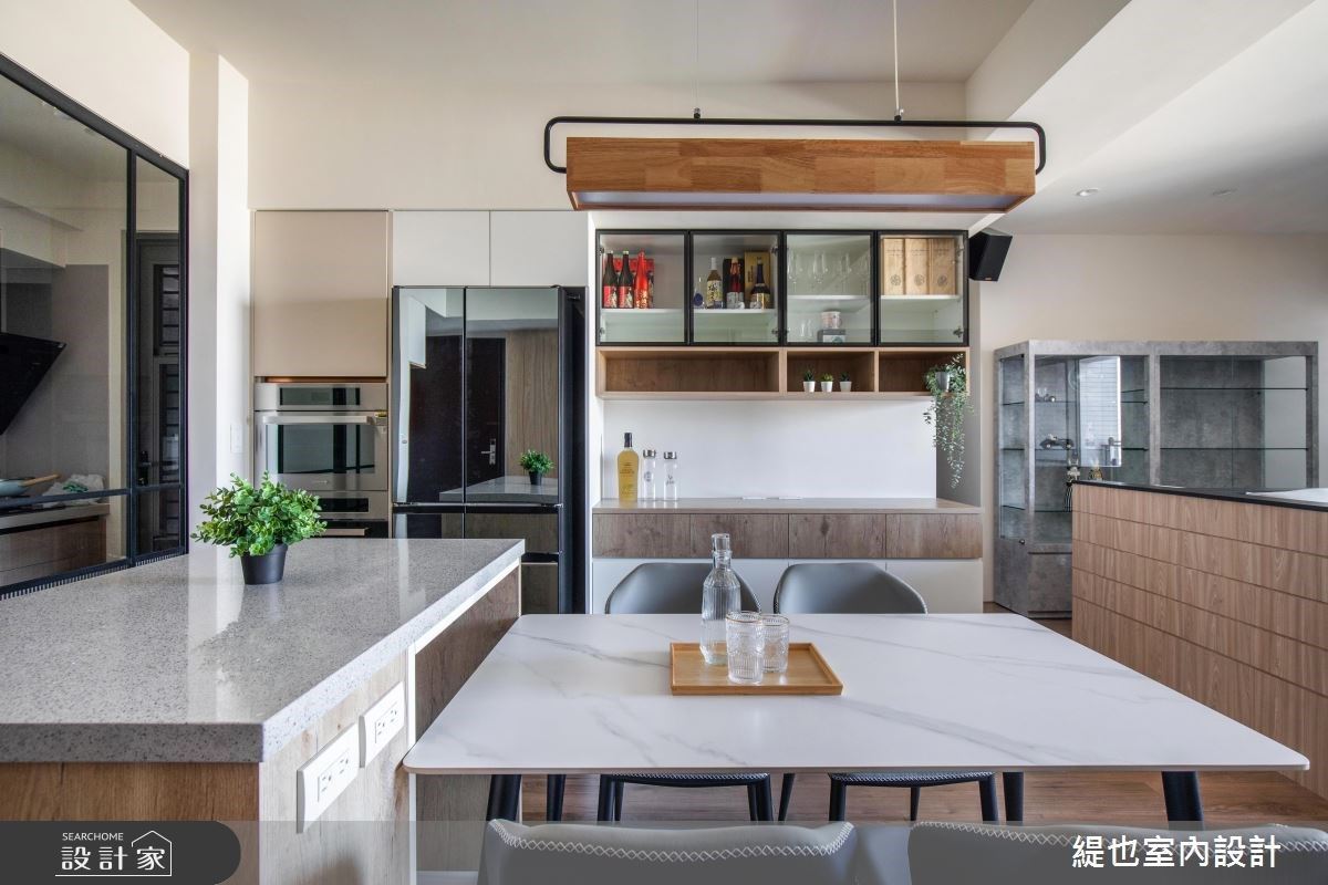 明代室內設計期待為居住空間引入陽光、通風等元素,創造與自然共生的自然宅。55坪的現代風預售屋,進門玄關因缺乏採光之故,在牆面上通過鏤空的造型,讓人造光源可以穿透到玄關,也讓另一間彈性空間也能分享光源,同時創造獨特的壁面造型。公領域為全開放式的狀態,電視牆由玄關延伸而入,木質材質大小錯落的方塊型態,隱藏收納櫃、同時引入自然植感。因居住者期待有寬裕的大餐廚,考量管線後,將廚房規劃為靠窗位置,在不阻擋明亮採光的狀態下,通過透空收納層架做為櫥櫃使用,創造實用機能性,也讓陽光自然而然流動於空間中;中島上規劃有IH爐,與餐桌串聯後,出菜、加熱便利,更可容納較多的用餐者,讓迎賓宴客更為方便。