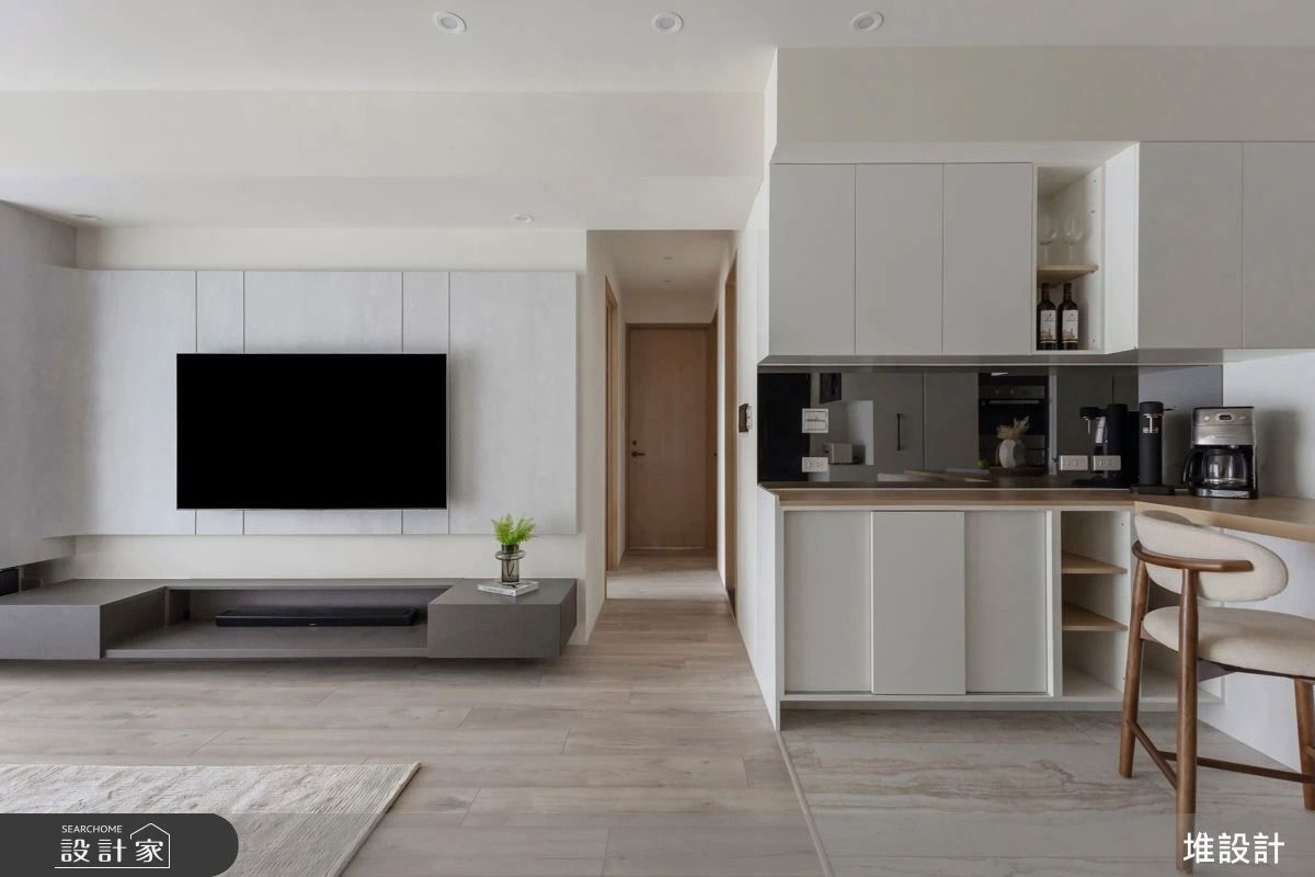 因屋主一個人居住,房子也有著很好的採光,因此設計師以純白色為主軸,並取消了局部的廚房隔間牆,將料理爐火的一端隱入深處,開放的部分則延伸為中島餐桌,既減少了油煙問題,串起客廳和閱讀區的舒適生活圈。當屋主在家時,可以好好地放鬆自己、下廚、整理家裡,從平凡的日常中重新認識自我,以及享受生活的過程。