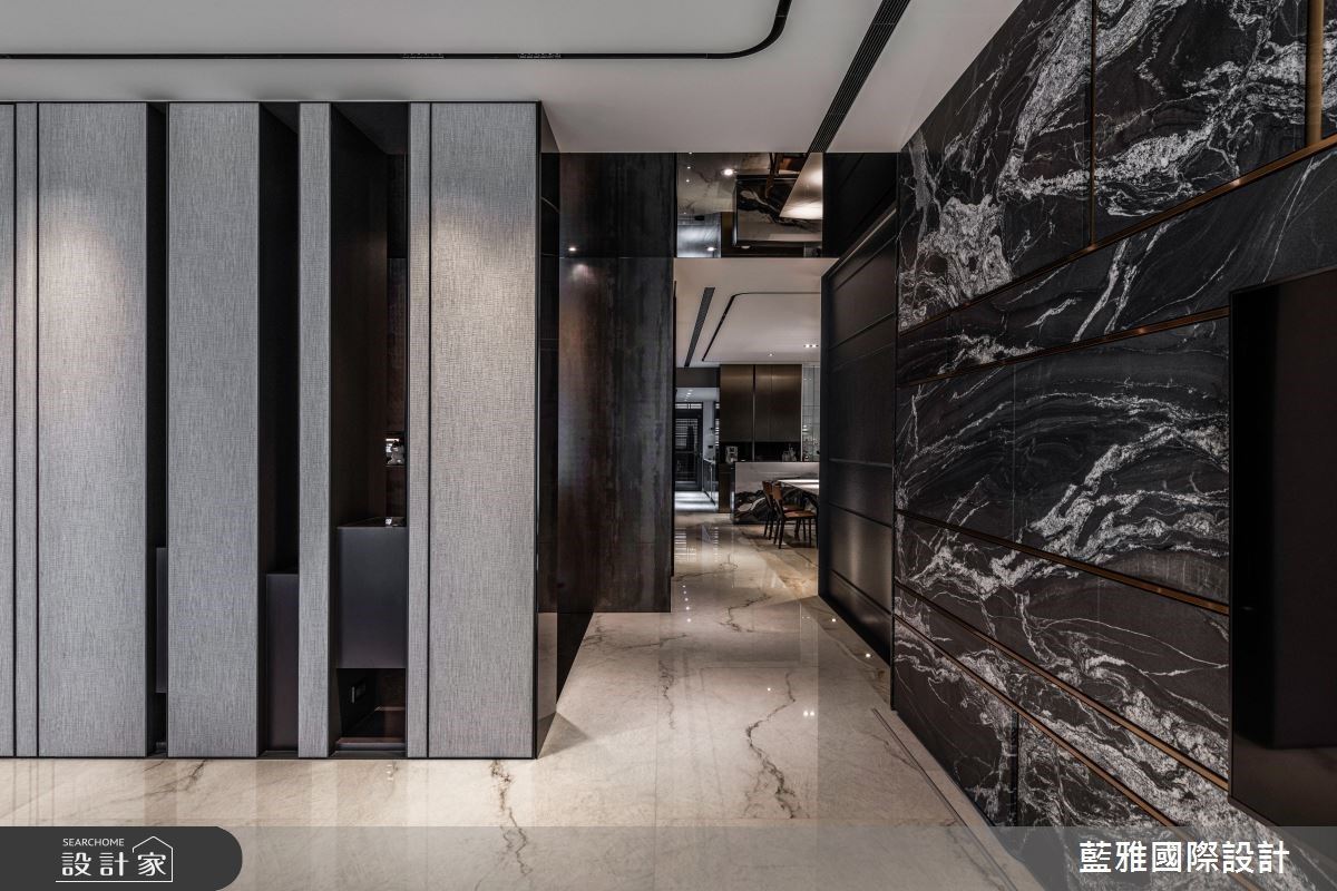 在這一層一戶的 70 坪住宅,擁有獨立的外玄關,立面鞋櫃運用灰色編織布紋,襯托出淺色大理石的圓弧端景,達到心靈沉澱的效果。內玄關廊道利用木隔柵設計,呼應公領域的大理石與金屬牆面。