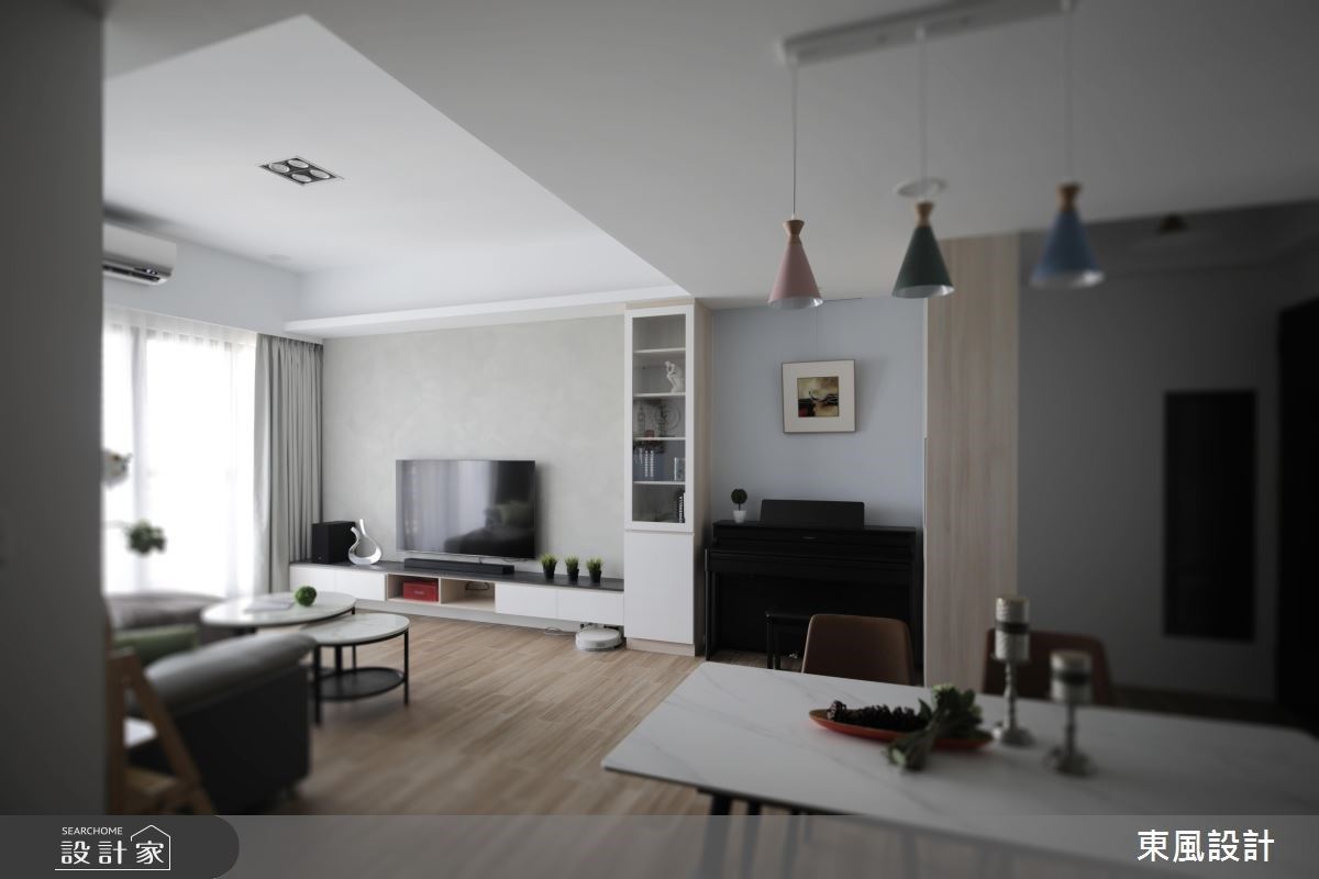 入室後的玄關,安排白色頂天櫃體延伸至客廳,整倒立面整合鞋櫃與日常收納,滿足實用生活所需;櫃體側邊以深色層板與漂浮櫃,開放、延展視覺,同時形成端景美學。櫃體與天花板樑線切齊,自然劃分客廳與玄關、餐廚區;大面落地窗延伸陽台區,並可享有戶外建築與綠意美景,客廳電視牆以簡約白色為基底,天花大樑結合嵌燈照明,弱化量體,並營造柔美視覺。