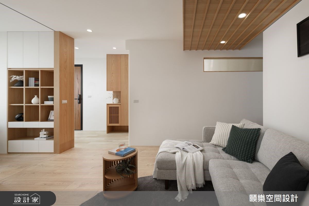 為解決原採光不足的劣勢,選擇將臥室隔間牆拆除,改透過玻璃材質重新建構場域分野,最後再將客廳旋轉90度,退讓出空間餘裕,成就獨立玄關與大量收納兩機能,為居家空間奠定實用基礎。客、餐整體色調以暖色為主、灰、白為輔,透過色彩心理揉捻療癒氛圍,半高電視牆緊鄰玄關鞋櫃,後方餘裕空間猶如小型和室,素日裡可作為孩子秘密基地,下方架高地坪則融入大量收納,滿足一家四口所需。客廳、餐廳與書房透過開放式設計與玻璃隔間串聯,通透視野在無形間拉近居者距離。書房內書桌沿窗而設,工作閱讀疲累時還可抬頭望向窗外,為五感提供休憩的所在。