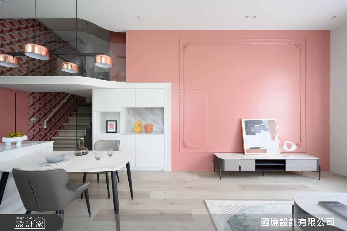 一樓是全家頻繁互動的公共空間,於是選擇沒有間隔、不受阻礙的開放式手法,將客、餐廳機能相互連結,引導清亮的光影能遊走於室,烘托溫暖放鬆的氣息。而大片的沙發背牆注入寧靜的莫蘭迪綠,創造光合作用般的綠植意象,更藉機串起客、餐廳的場域連結。
