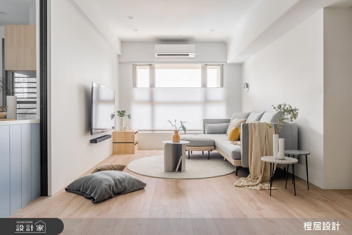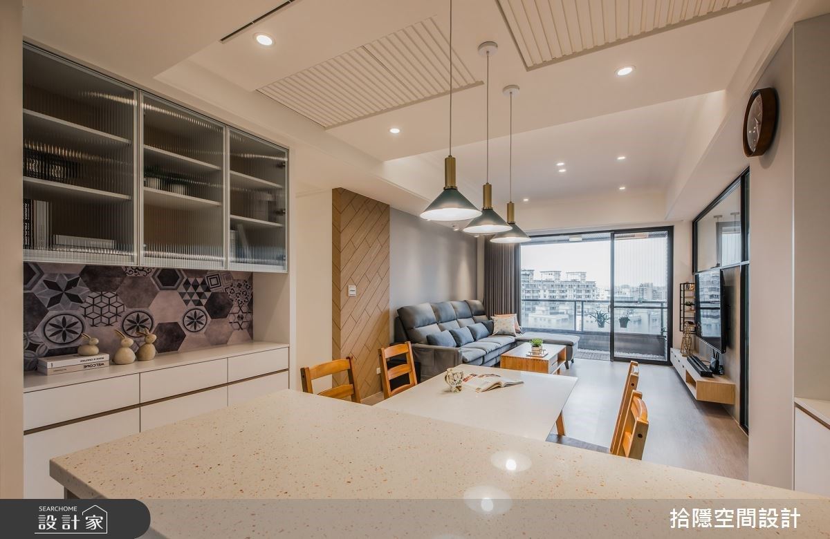 視覺設計上,富含淺灰石紋的電視主牆,以內嵌造型結合收納機能,並加入鐵件層架銜接L型木質櫃體,最終以懸吊的長虹玻璃屏風收尾。透過不同質材的拼接,讓原本純粹的實用性收納,轉化為一氣呵成的美型端景。同時,為了避免櫃體太過沈重,底部透過間接光源,以及柔和的弧線光帶,柔化邊角的銳利度,更締造空間的吸睛亮點。