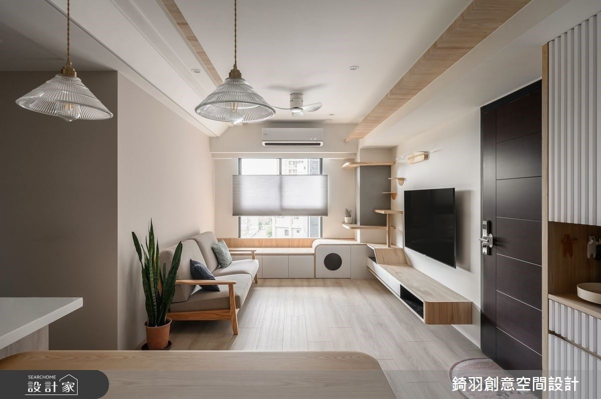 玄關以灰階石板造型鋪設地坪,與木質地板的室內有所界定,右側以木格柵屏風遮擋,避免開門看透的風水疑慮,也導入公領域部分光線以提升視覺明亮度。客廳電視牆以清水模質感的壁面為基底,搭配漂浮感的白色壁面與木質檯面,創造漸層的美學立面;且善用電視牆上方深度規劃貓走道,延伸至側邊、銜接餐廚空間裡的貓跳台,勾勒出專屬喵星人的生活場域。