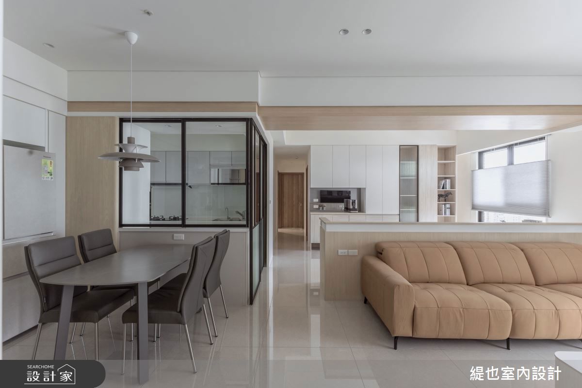 一體成型的玄關、客廳場域,延伸明代古董梅瓶的個別語彙,主色調援引清透的暖玉白,與大面落地窗灑落的光影,形塑明亮寬敞的空間感,電視主牆選擇泛著珠光的珊瑚粉石材,搭佐伽羅沉香的深木質櫃體,渲染內斂典雅的神情,日後擺上神明桌,也不會與美感相互衝突。此外,天花設計援引梅瓶的弧線瓶身,透過圓弧設計修飾轉角,並向上挑高,渲染寧靜朦朧的迷人光感。