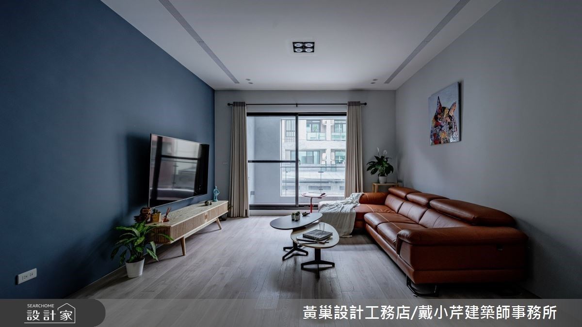以明亮的北歐風白色系做為整體空間的主軸,地坪以深色的石紋磚鋪續穩定整體氛圍,餐廚區域以胡桃木色木隔柵天花定義餐廚區域。電視牆規劃簡潔而純粹,使用原木做為擺放展示品及影音器材的檯面,實現俐落的規劃和設計。寬敞的ㄇ字型廚房與餐桌結合,達到完善機能及出菜動線的目的。