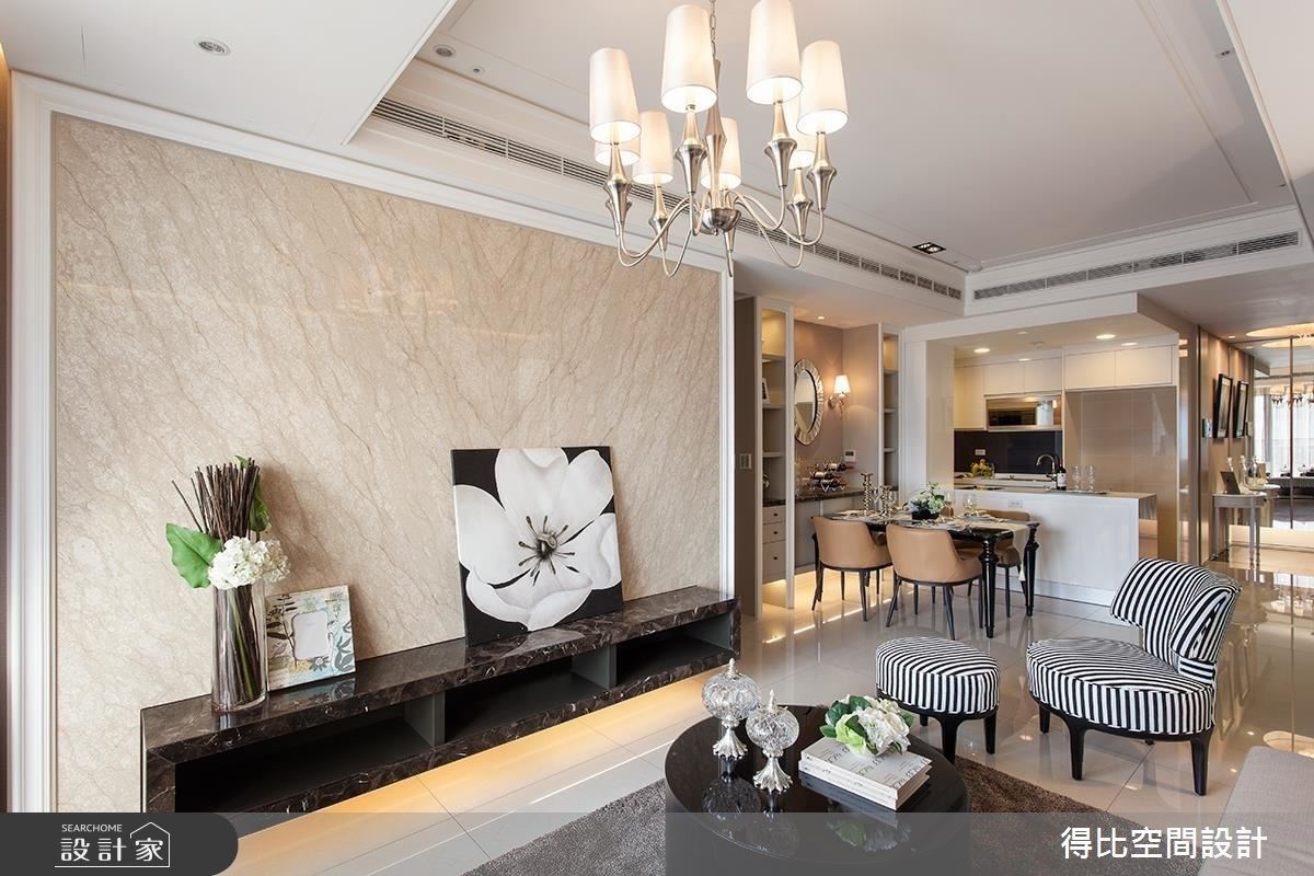 步入玄關廊道,以鏡面與鍍鈦交織而成的展示櫃映入眼簾,具反射的視覺,搭配上俐落的線燈勾邊,形塑大器又現代的氛圍,轉角處餘裕增設穿鞋椅設計,為長輩與孩子提供能輕鬆穿脫鞋子的空間,使用起來更安心,通往公領域的過道選用灰調特殊漆與黑玻鋪陳,為轉換空間的過渡,返家過程更有儀式感,而與客廳牆面銜接的稜角以弧形修飾,視覺柔和之餘還避免意外碰撞的機率。公領域選用開放式設計,僅透過天花大樑暗示空間分野,客廳大理石電視牆視覺優美,側邊展示櫃不規則分割,又增添一絲活潑調性,軟裝部分延續低彩度色彩,並透過異材質搭配堆疊豐富層次,猶如五感饗宴般耐人尋味,沙發背牆利用線燈勾邊,前後遞進的手法賦予立面動態視覺,可謂居家端景的一隅。