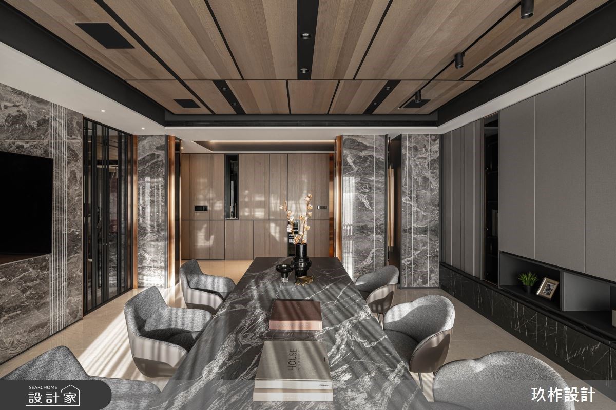 經由展示家人收藏的開放式展示櫃進入,餐廳與廚房區域在格局重整後規劃於同一區域,並且開放相鄰、置於同一軸線上,以造型吊燈定義餐區,將烹飪的過程與用餐體驗更緊密地結合在一起,增加社交互動的機會。