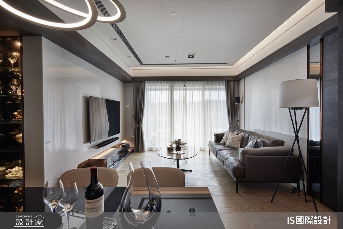 沿著玄關區進入室內,設計師規劃了豐富的收納使用,在底端則改以開放的展示區,化解了廊道的封閉感,也為公共空間創造優雅的藝術端景。客廳與餐廚之間保留了開闊自由的動線,而沙發牆上的淺色石紋和深色木紋理,則形成了鮮明的跳色對比,不僅劃分出領域的秩序範疇,也具有延伸視覺的效果。