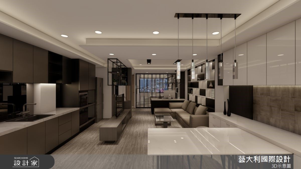 餐廚場域,選擇可透視的玻璃拉門為屏,不但屏除油煙的干擾,也能維持寬敞通透的空間感,避免封閉窒礙的感受;內部採二字型的動線規劃,先是井然有序配置烹飪區、電器櫃與冰箱,再加入中島吧台結合用餐餐桌,額外增添流理臺功能,讓烹飪時光更為便利彈性。
