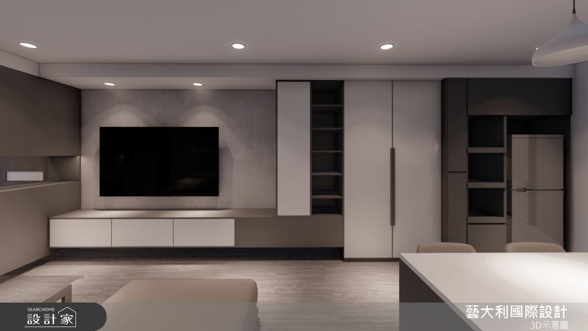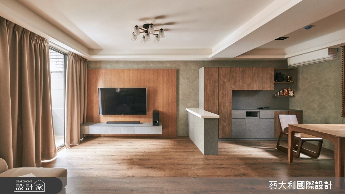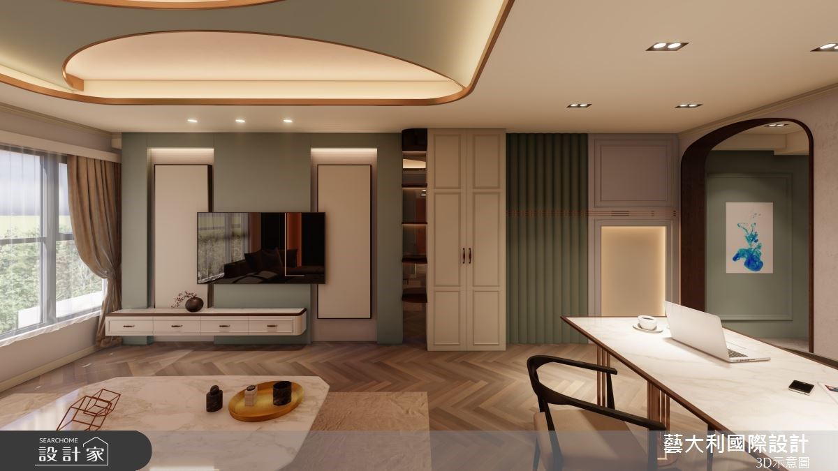 推開大門,以木格柵線條、深海藍色調為底,透過弧形光帶遊走,巧立一道遮蔽的端景屏風,劃下緩衝進出的玄關場域外,踏進家門前,也能沈澱心情、轉換情緒。客廳場域,沒有繁複造作的設計元素,從電視牆面到地坪以一氣呵成的手法,注入義大利進口大板磚,烘托優雅清爽的氛圍,輔以沈穩的海軍藍沙發背牆,以深淺對比成就迷人美感。同時,天花設計、沙發立面延續圓弧語彙,透過不規則的佈劃,形塑流動跳躍的視覺,