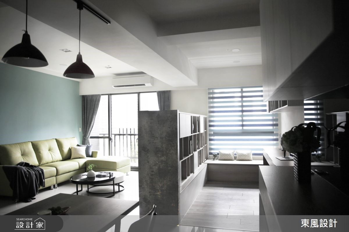 客廳後方空間融入臥榻概念,選擇將地坪架高,再搭佐側邊層架與下方收納,氛圍療癒如隱世秘境。