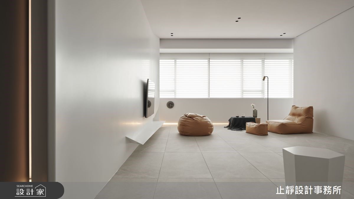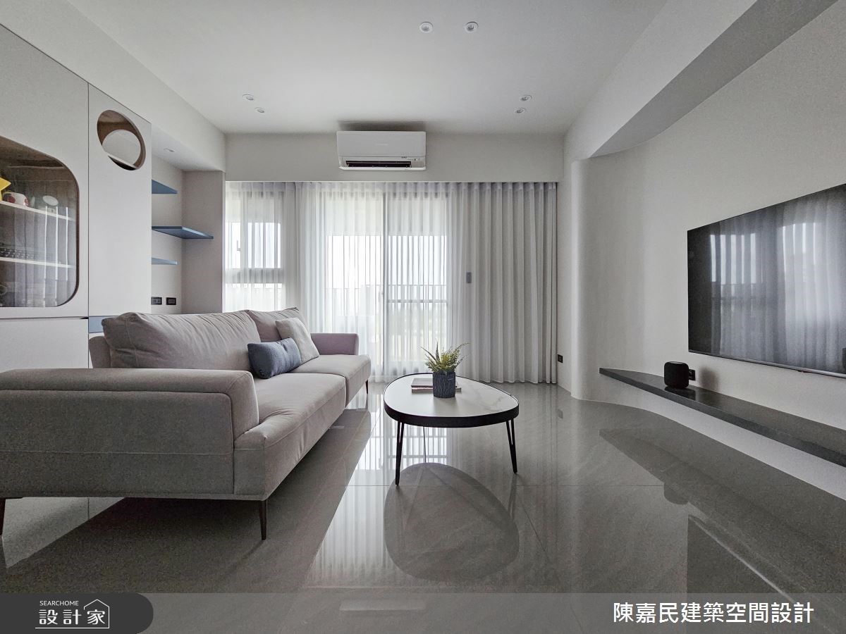 玄關以灰調為地,白色為天、壁,並將懸浮櫃體沿樑下規劃,巧妙隱去巨大量體,建構出富有機能又不壓迫的入室空間。沿著廊道步入室內,盡頭電視牆邊櫃以弧形門片點綴,溫潤視覺有如居家端景的一隅,也使整體視覺更柔和。開放式公領域以天花樑柱暗示分野,雙採光面與通透空間使自然光線遊走於各處,視覺更輕盈通透,書房櫃體結合封閉與開放兩種,考量開放式櫃體多擺放常用物件或展品,選擇規劃於可輕鬆拿取的高度與最低處,地震來臨也較不易發生物品砸落意外,而封閉式櫃體則規畫於頂天處與腰部高度,用於放置不常用的物品,分門別類設計更有條理。