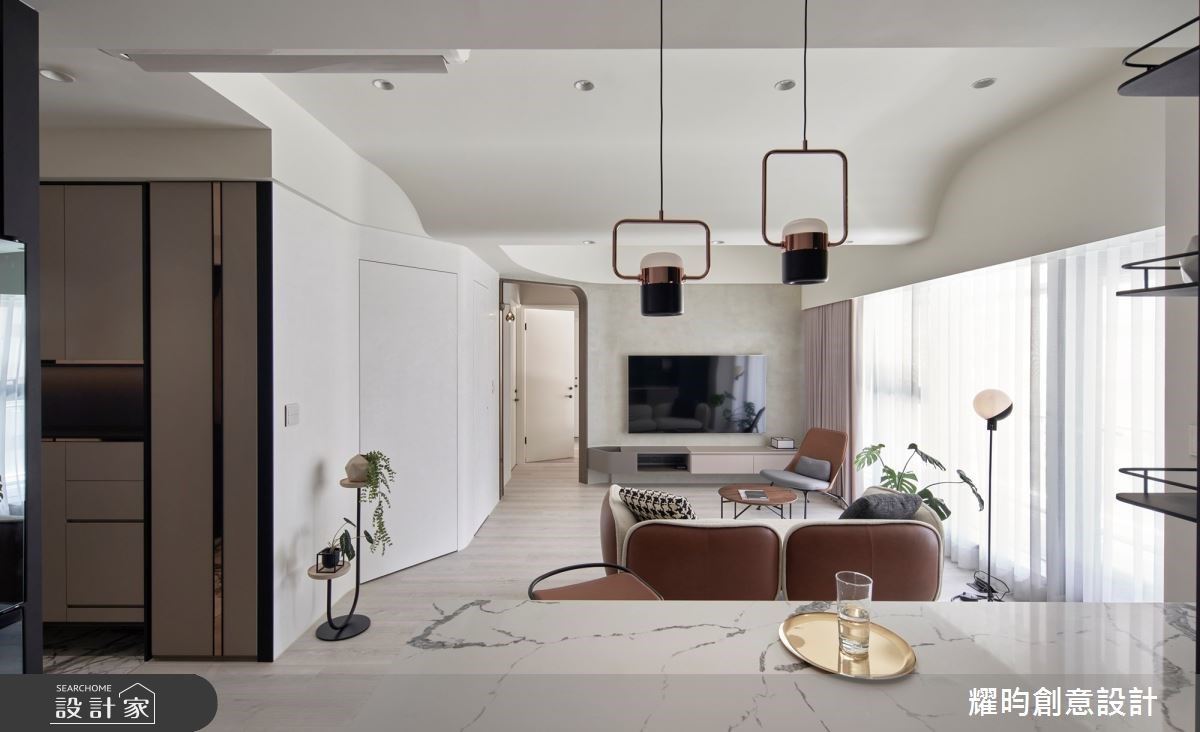 邁入公領域,空間色彩以大面積留白為基底,奠定清爽簡約的居家氛圍,並鋪敘溫潤的木質地坪,適度留有居家溫度,居宅原先的壓迫樑柱則以刻意裸露的設計手法,成功地將缺點轉換為居宅的亮點;格局規劃上,以開放式設計為主軸,強調了個人與社會之間連結的重要性,無形昇華家人間的情感連結,透過活動式家具及軟裝明確場域分野,而開放式餐廚設置美型中島,化身烹飪及用餐的銜接媒介,烹飪廚房則以玻璃拉門為界,餐廳擺放圓弧餐桌,特色懸掛燈飾更為空間畫龍點睛,其次臨窗處以木百葉挹注清新爽朗的意象,更可隨屋主需求彈性變換入室光線的多寡,皮革造型沙發也徐徐地描繪出休憩客廳的鮮明表情,整體營造滿足了自然日光的空間建築美感。