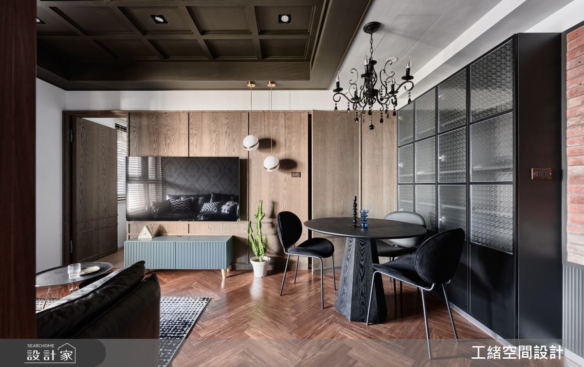 透過磁磚與木地板劃分場域,走道上使用木紋製作吧檯,並規劃三道通往廚房、客浴與客房的隱藏門,創造一面溫潤且簡潔的視覺牆。餐桌上方垂掛一盞環繞、金屬材質的餐燈,為沉穩的空間調性注入華麗美感。