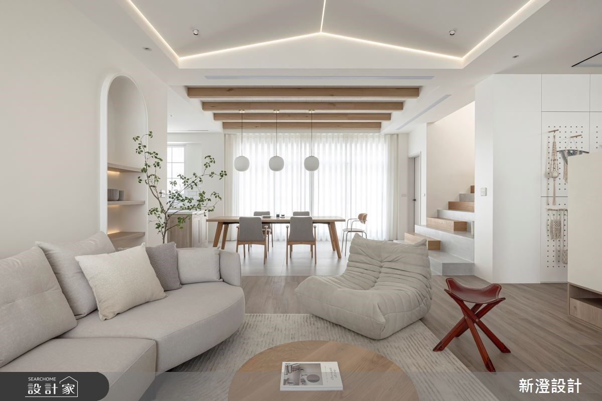 客廳擺設弧形米色沙發,聚焦視線並凝聚家人情感;餐桌上方安排一盞鐵件交織的結構燈飾,展現星光熠熠的大自然意象。照明安排上,於櫃體或天花板的邊緣融入大量燈條,搭配弧形的設計語彙,流露細緻、柔和的場域氛圍。