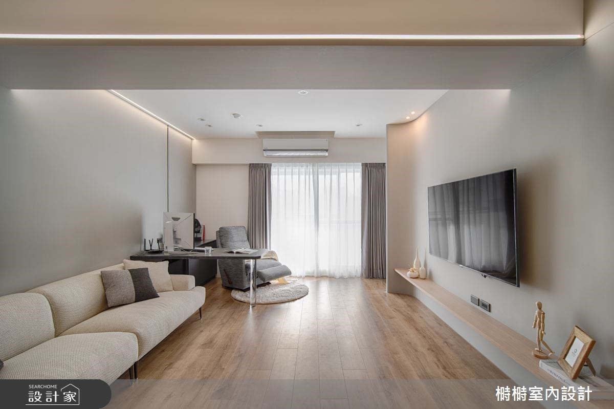 邁入居室,以深灰色弧型隔間區隔出落塵區及客廳、廚房三場域,側邊配置大面鞋櫃,給予屋主豐厚的收納機能,櫃體中段以部分鏤空,昇華量體的輕盈感受,同時造型屏風結合橘棕色穿鞋椅,兼顧消弭風水疑慮的效果,更奠定了精緻細膩的第一印象;公領域以開放式設計為主軸,爭取更寬廣的視覺饗宴,選用樸質米為色彩基底,奠定了舒適暖心的空間意象,同時為了強調客廳及餐廳的開闊感受,設計師大膽繪製出了獨一無二的家具軟裝,廳區的湖水綠沙發更是建構起共享椅背的理念,不僅有效節省了客廳及餐廳間的過道,也在無形中凝聚起家人情感,深刻的情感表徵也使居宅有了更加鮮明的表情;餐廳後方捨棄既定的隔間形式,改用一道弧形圍塑用餐場域,擺設特別訂製的三角形圓潤餐桌,與立面處的弧形語彙相互呼應,在坪數有限的情況下,縝密規劃每一空間的使用坪效,打造機能美學並俱的現代風小宅。