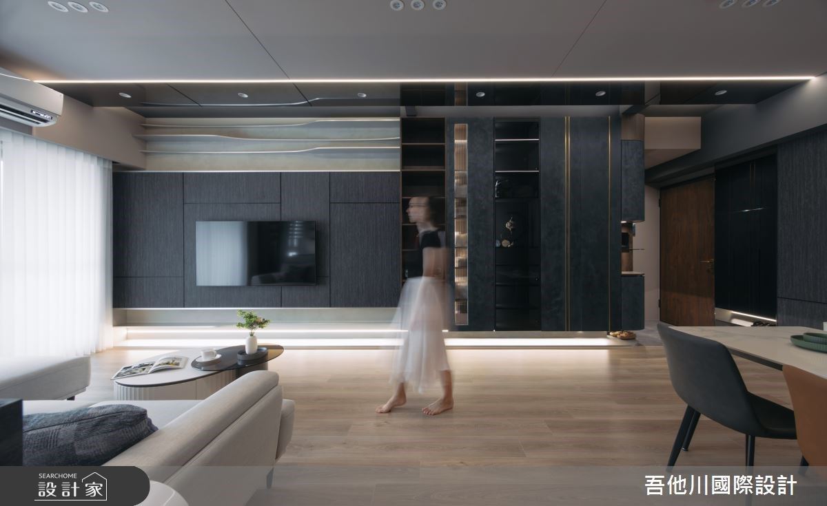 擁有舞台設計專業背景的李紹瑄總監,認為住宅設計就如同舞台設計,居住者就是出演每日生活的主角。客廳主牆採用新式薄板磚,厚度僅 0.6mm 與木作結合呈現石材少有的輕盈感,輔以垂直的鐵件層架、橫向懸浮電視櫃與燈帶照明。天花板層次裝飾與線燈照明,透過輕柔堆疊消弭大樑壓迫感,扭轉退休宅沉悶單調的形象,以時尚簡約的姿態開啟人生下半場。沙發背牆整面白色櫃體收納特別在轉角處做簍空,可作為花藝展示台陳列與展示,讓空間隨著四季變化擁有不同色彩。
