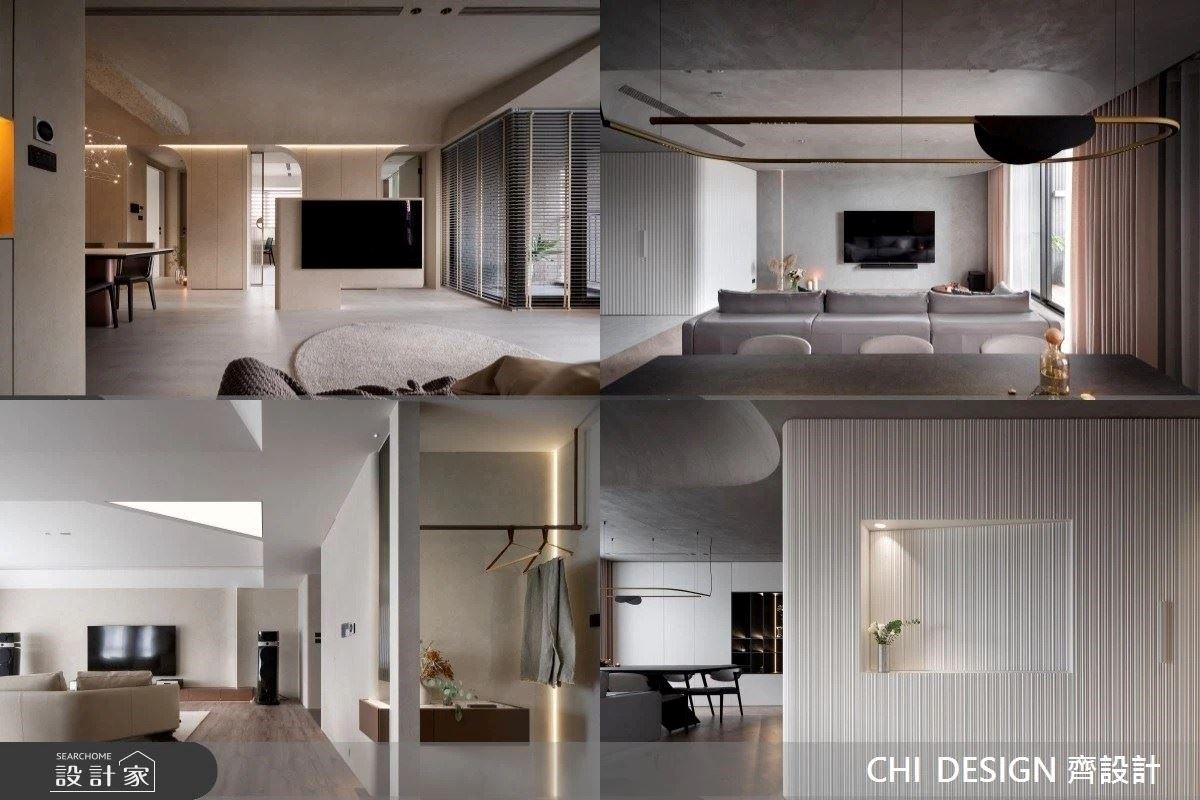 為了營造一個讓人感到寬慰和放鬆的休憩角落,於客廳設計了一座圓弧牆面,巧妙地柔化了空間的線條,營造出一種被環抱的感覺;牆面結合照明燈條和背板的使用,進一步增添了空間的層次感。電視牆採用了簡潔的設計,將所有設備和接收器都收納在背後的儲物櫃中,既美觀整潔,又保持了視覺的純淨感。整體環境營造了溫暖而柔和的氛圍。家具的色調與牆面相呼應,營造出舒適和寧靜共存的感覺。考量到屋主遊歷歐洲各國帶回來的諸多紀念品,設計師特別規劃了多處收納展示空間,供其展示從國外帶回的珍貴紀念品,不僅展現了旅行回憶,也體現了她對人生目標的追求和成就感