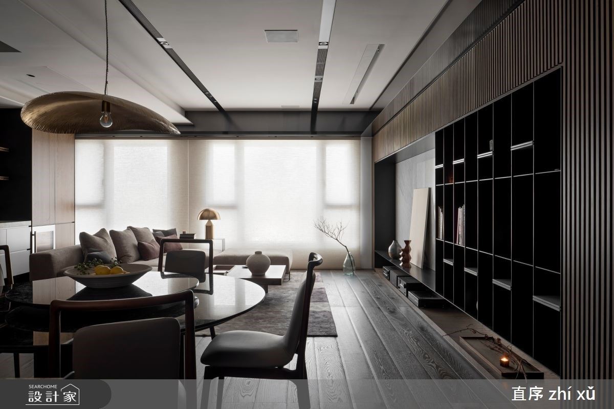 為了達成屋主喜愛的簡約俐落,餐廚區的門片皆隱身櫃面之中,整平頂天的櫃面,保持空間乾淨整齊的視覺感。