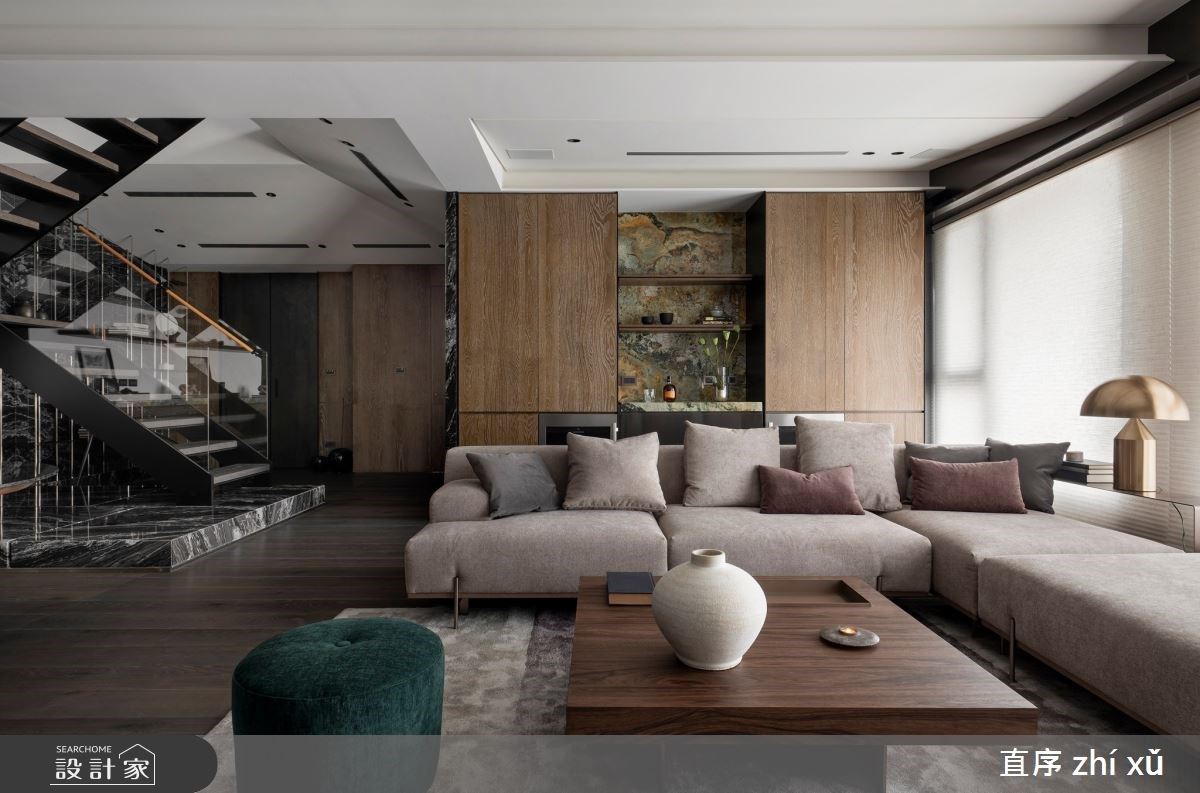 設計師從客變的毛胚開始布局四戶打通的格局,首要任務是將樓中樓的廊道轉向,使得整個空間視線隨著牆面展延,拉高整個電視牆,延續尺度到二樓的同時,也提升客廳空間的開闊感受;全室整體空間以淺色系加上木紋的元素,舒適的視覺感受同樣賦予大器,體現現代北歐的雕塑美感。