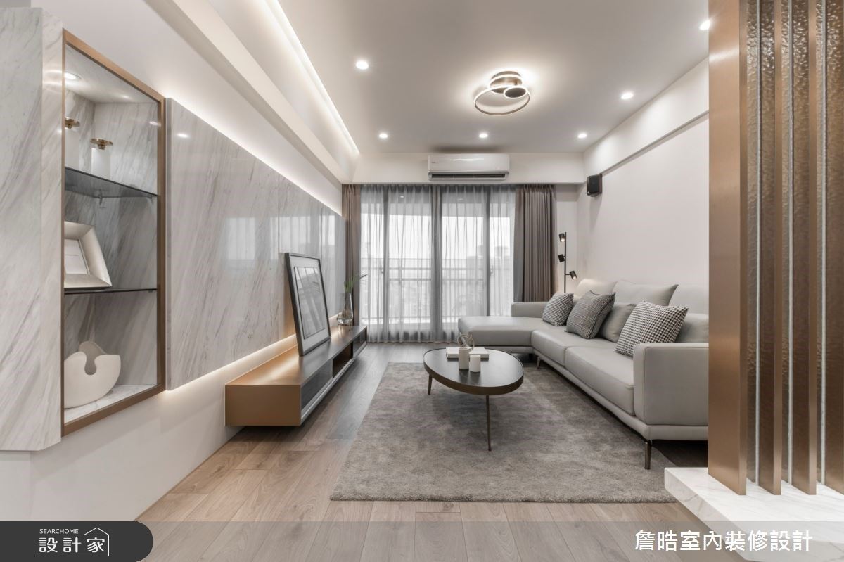 玄關長廊以木質地坪與灰調門片櫃拉開序幕,局部點綴的暖光挹注溫馨氛圍,讓家以最溫柔的姿態迎接歸來的居者們。沿著地坪與弧形倒角進入室內,有限的視野逐漸展開,全然開闊的公領域藉由大樑明確界線,再透過鏡面模糊存在感,若隱若現的視覺取得空間感與機能間的平衡。客廳電視牆延續玄關淺灰色調,以留白美學呈現配角之姿,讓人際互動成為空間重點,也賦予一家人更大的使用彈性。開放展示櫃鋪敘整面餐廳牆體,內斂黑模糊界線,創造出向後延伸的視覺感受,放置展品時將會是最好的配角,平日則可隱於無形,無聲的襯托餐廳燈飾,可說是公領域的獨特端景。
