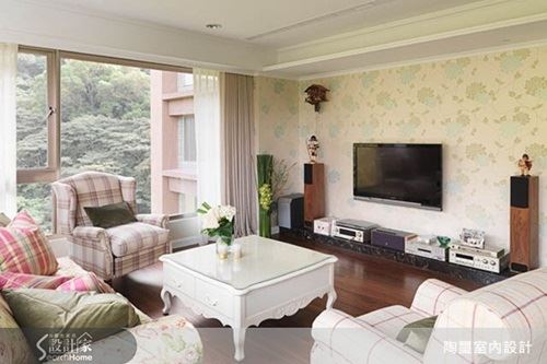 入口玄關處,融入羅馬柱營造對稱美學,並選用具有質感的皮雕工藝壁布,通過精緻的細節營造低調奢華的魅力,成為令認無可忽視的迎賓端景。進入屋內,首先映入眼簾的是具有北法風情的公領域,柔和的淺色調牆面為空間古典的優雅氛圍,而沙發背牆上的芭蕉葉圖騰則象徵著「家大業大」和「長壽健康」的美好祝願,百葉窗透入柔和自然光線,天花板則以屋架系統混搭不具特色的殖民風格。開放式廚房則選用了地中海土耳其藍鐵道磚,搭配莨苕葉壁布,展現高貴氣質,令人彷彿置身於歐洲王室的宮殿中。