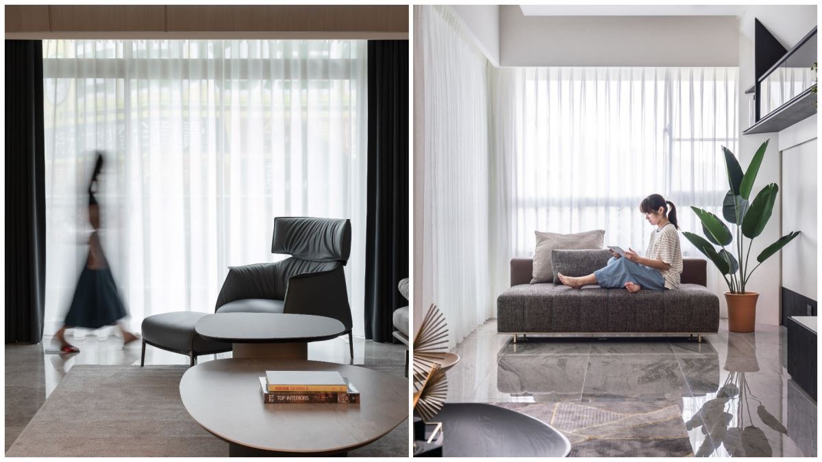 第一個案例是現代輕奢風格的六口之家,其中空間融合陰與陽的特性,莊媛婷、鄭瑞文設計師將皮革配件結合金屬與跳色感家飾,讓低調奢華的空間得以提升家的溫度。而多功能室的設計上,除了規劃為會客室外,還可作為客房或孩童遊戲區使用,提升空間的運用彈性。