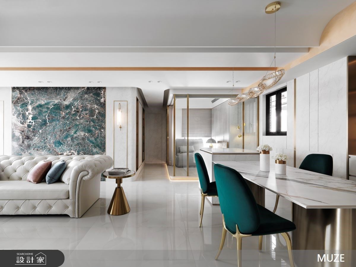 全室打破傳統對豪宅的想像,公領域的天、地、壁皆注入暗沈的黑色調,從紋理細密的冷黑義大利藝術漆,壁面的烏黑天然大理石,到富有光澤的義大地磚,透過一致的同色調,深入鋪排異材質,悄悄流露豪宅的一絲精緻氣息。而客廳茶几、餐桌與中島檯面,分別選用碧綠、深灰等華麗石材,加上水晶燈的投射、光帶線條的遊走,創造光澤流動的視覺饗宴。